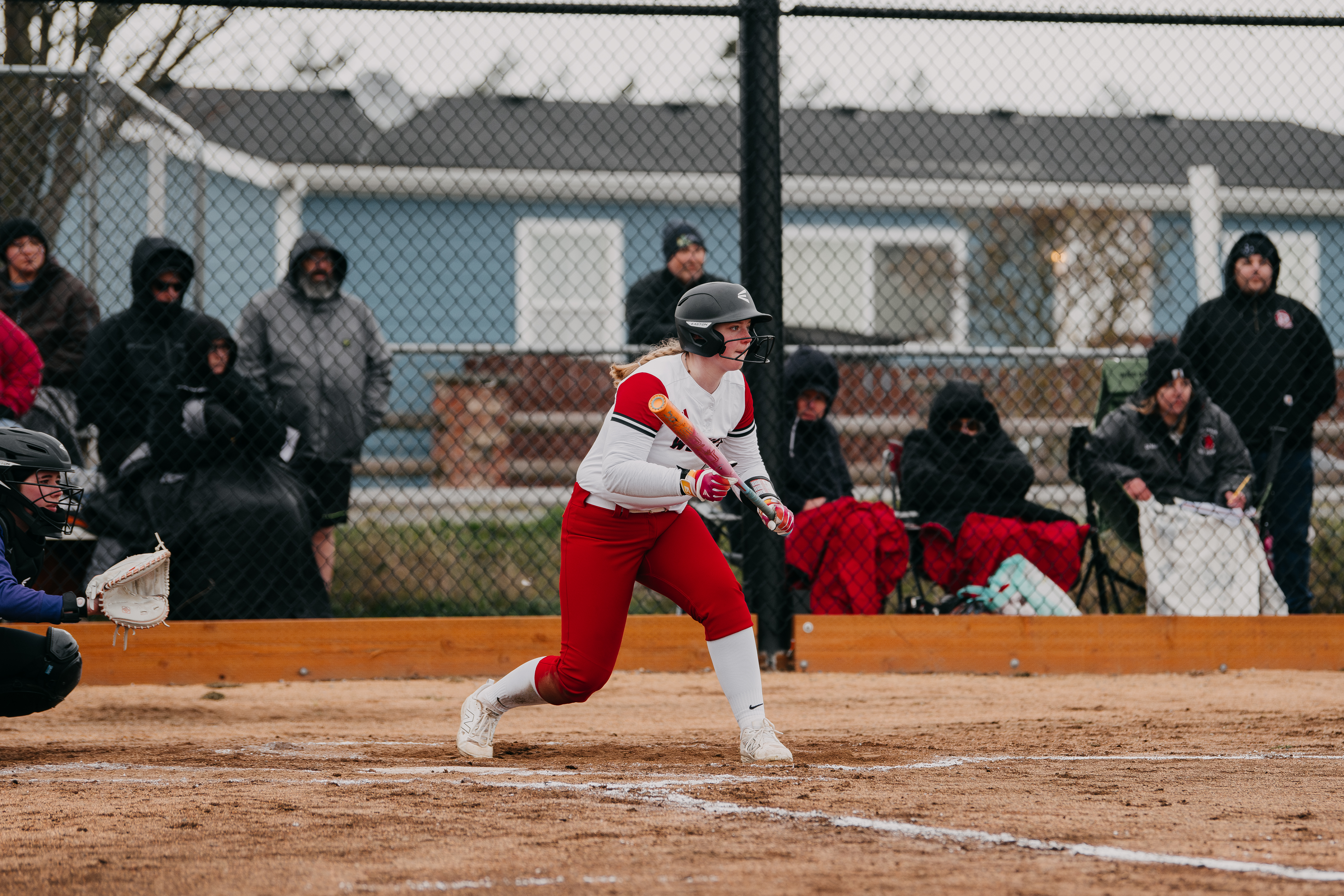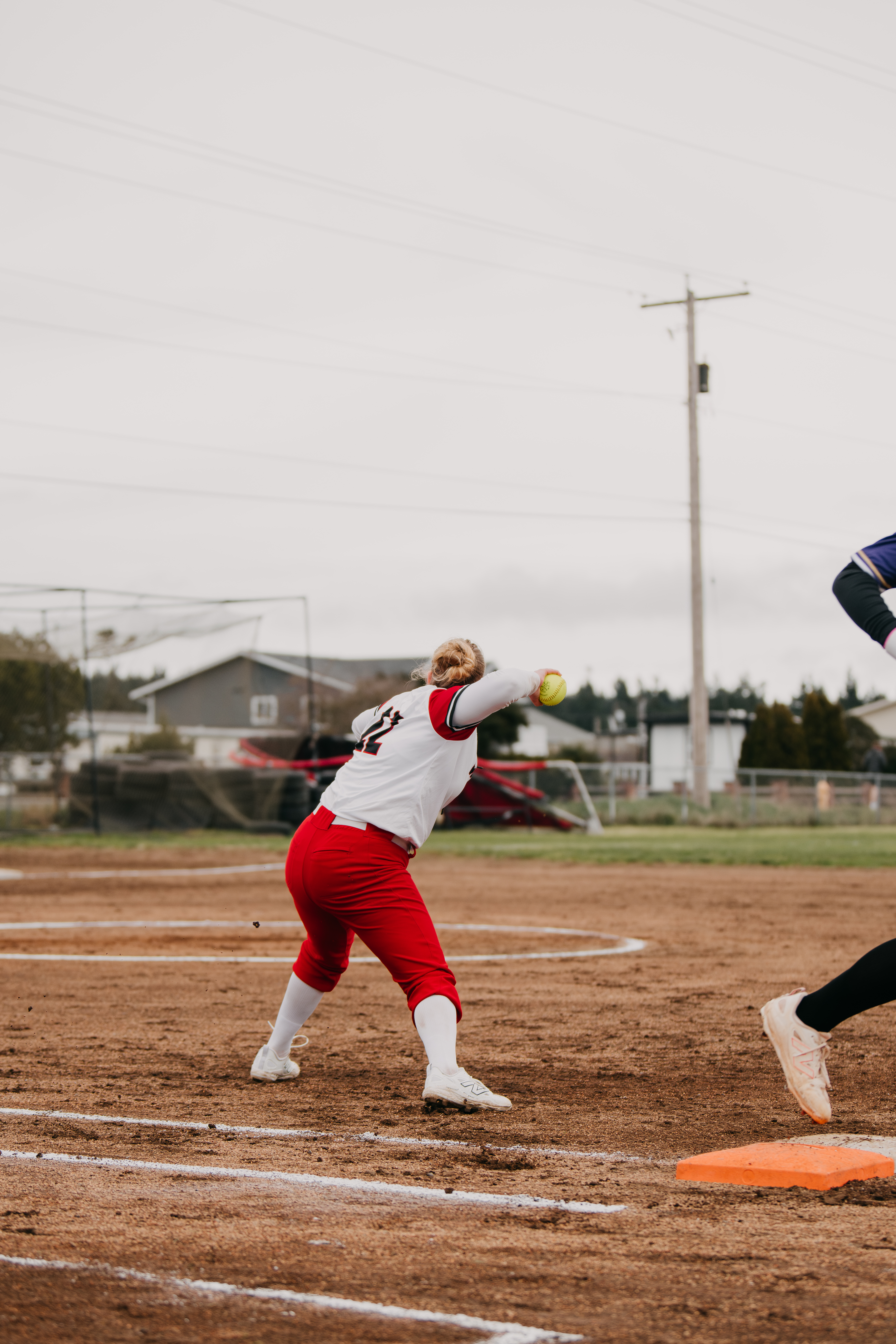 It was one of two painful moments for the hosts, as later a batter in pursuit of a hit took a spectacular fall midway down the line to first, then kissed sweet, sweet wet turf as Wolf first baseman Ava Lucero calmly tracked down the wayward ball and recorded the out.