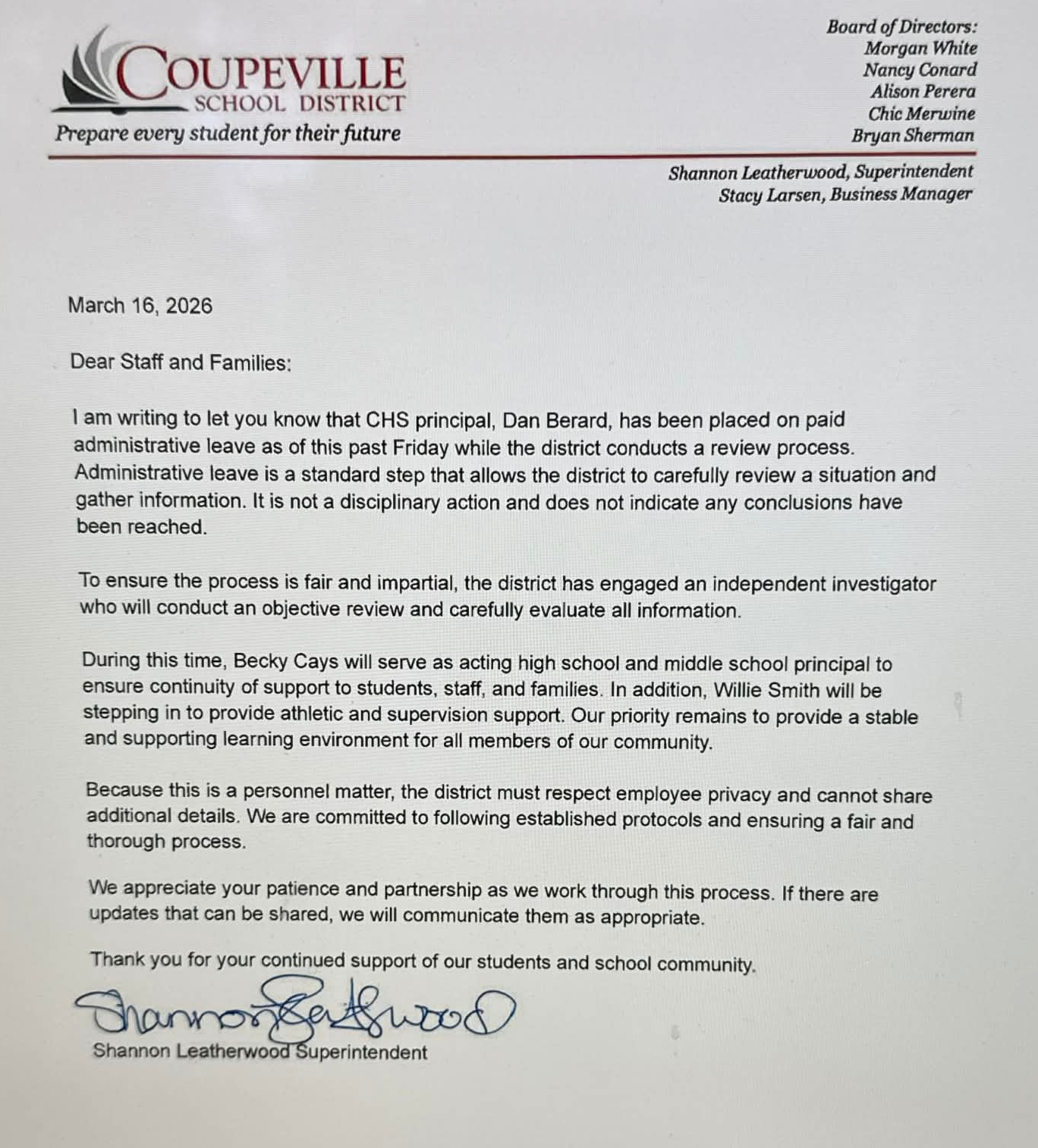 Monday, Coupeville Schools Superintendent Shannon Leatherwood released the following statement: