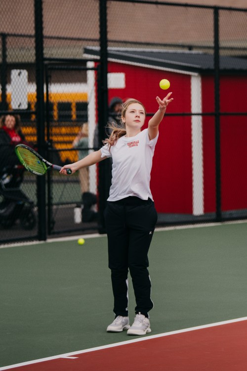 The afternoon’s most tense tussle came at first varsity doubles, where new partners Dahlia Miller and Aleksia Jump teamed up to pull out a victory in a tiebreak in a match which went back-and-forth.