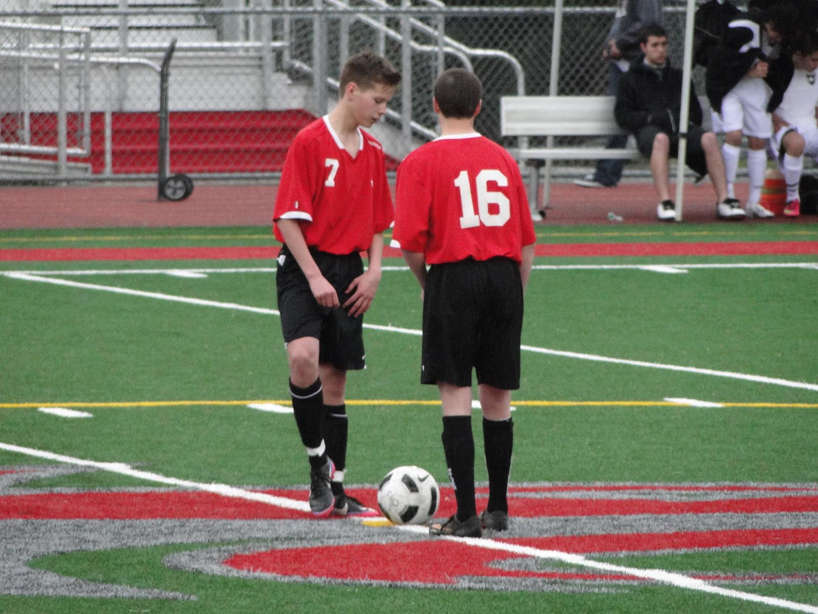 Danny Savalza (13) battles for the ball, as Josh Wilsey (18) and Sean Donley trail the play. (Janine Bundy photos)