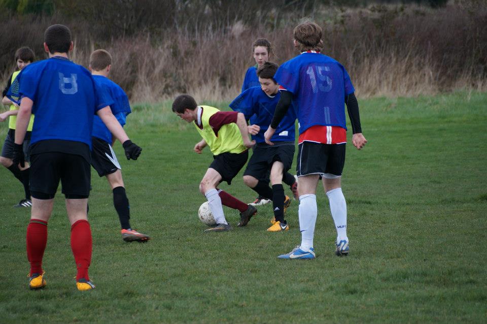 Sean Donley (yellow jersey) fights for the ball in a sea of blue. (Robert Pelant photos)