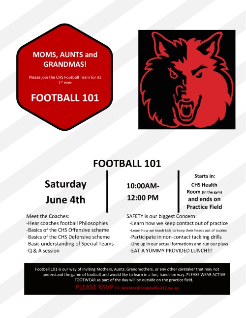 Things will start at the health room inside the Coupeville High School gym (first thing on your left as you enter the front door), then out on the nearby football practice field.