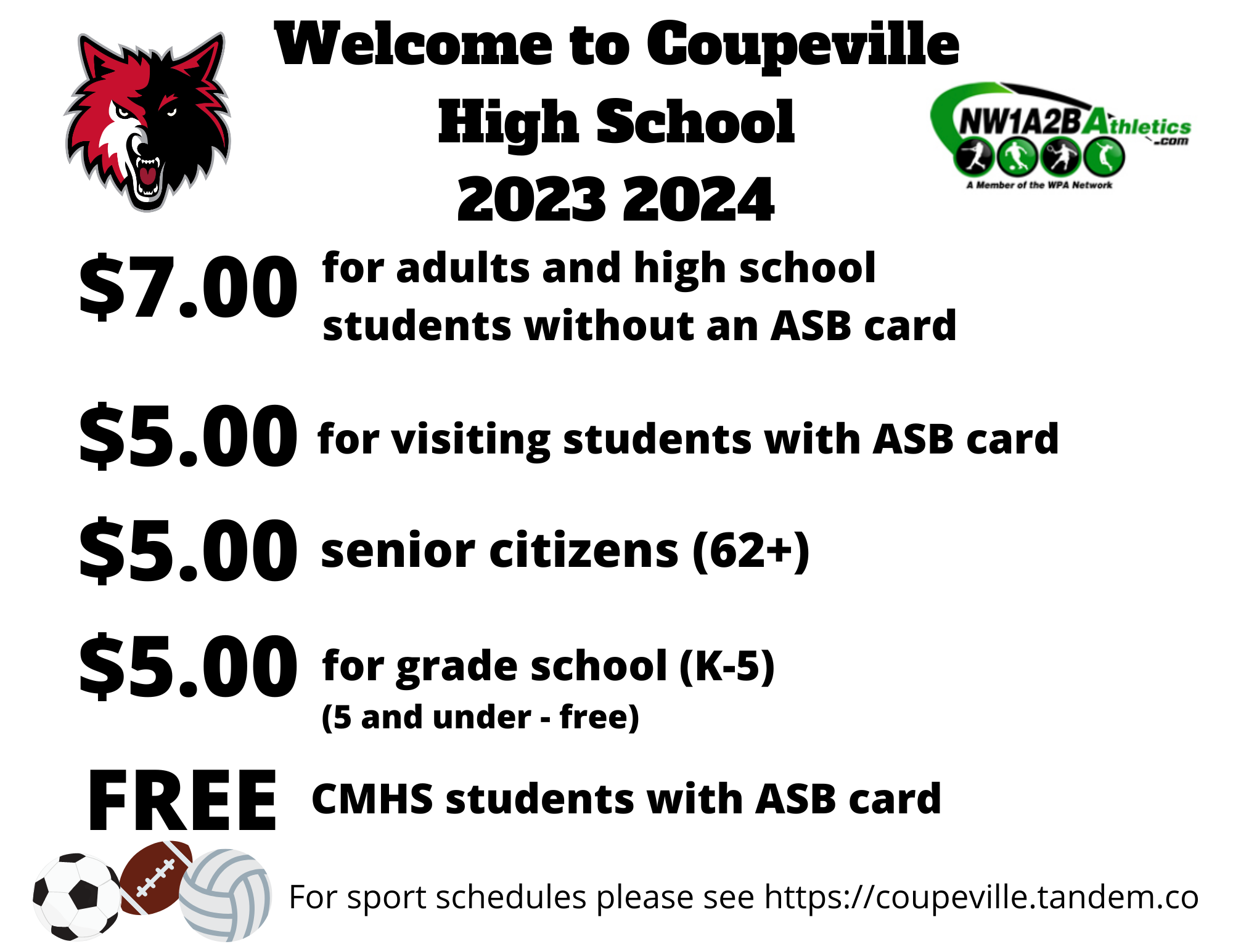 Regular season football, basketball, and volleyball contests require some moola to get in the door, while soccer, tennis, softball, baseball, track and field, and cross country are free.