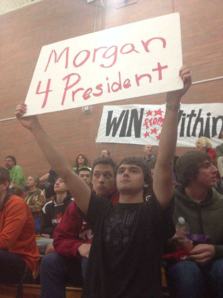 Brian Norris (with sign), Colin Belliveau (left) and Cole Payne (right) implore Wolf senior guard Morgan Payne to accept the endorsement of the Bad-ass Party. (Shelli Trumbull photo)