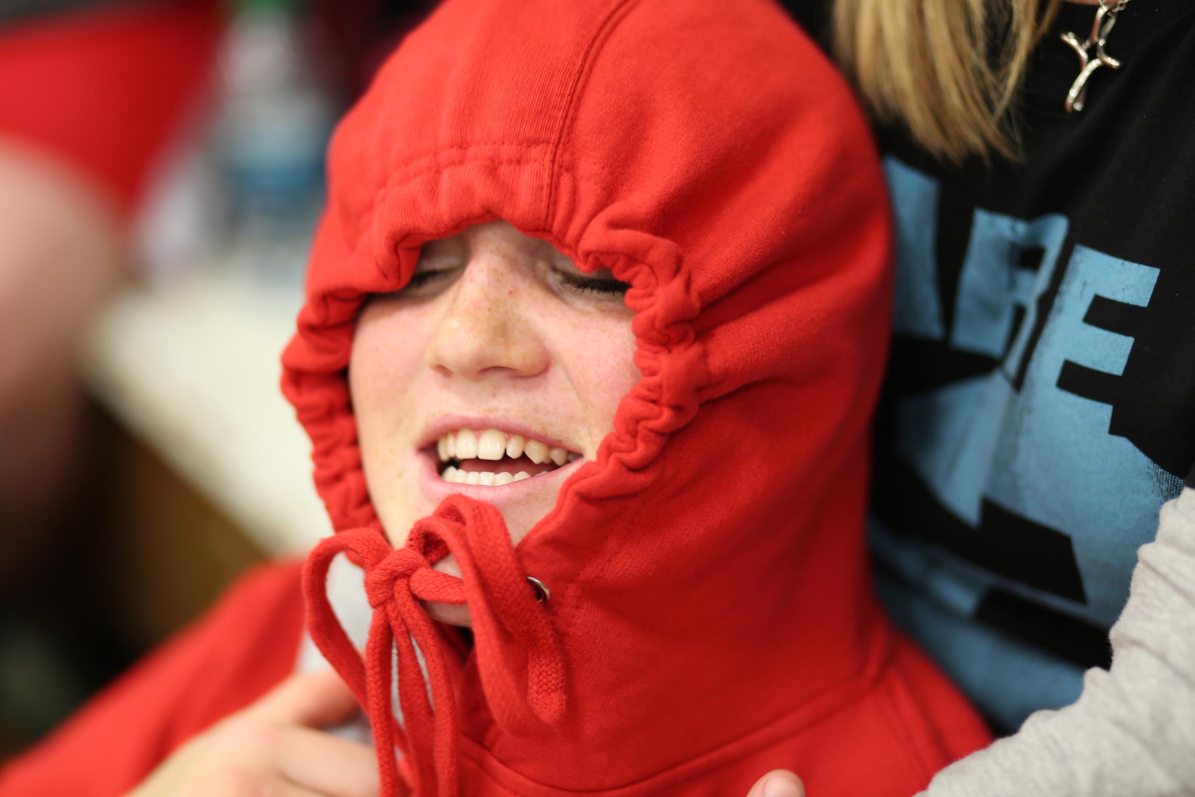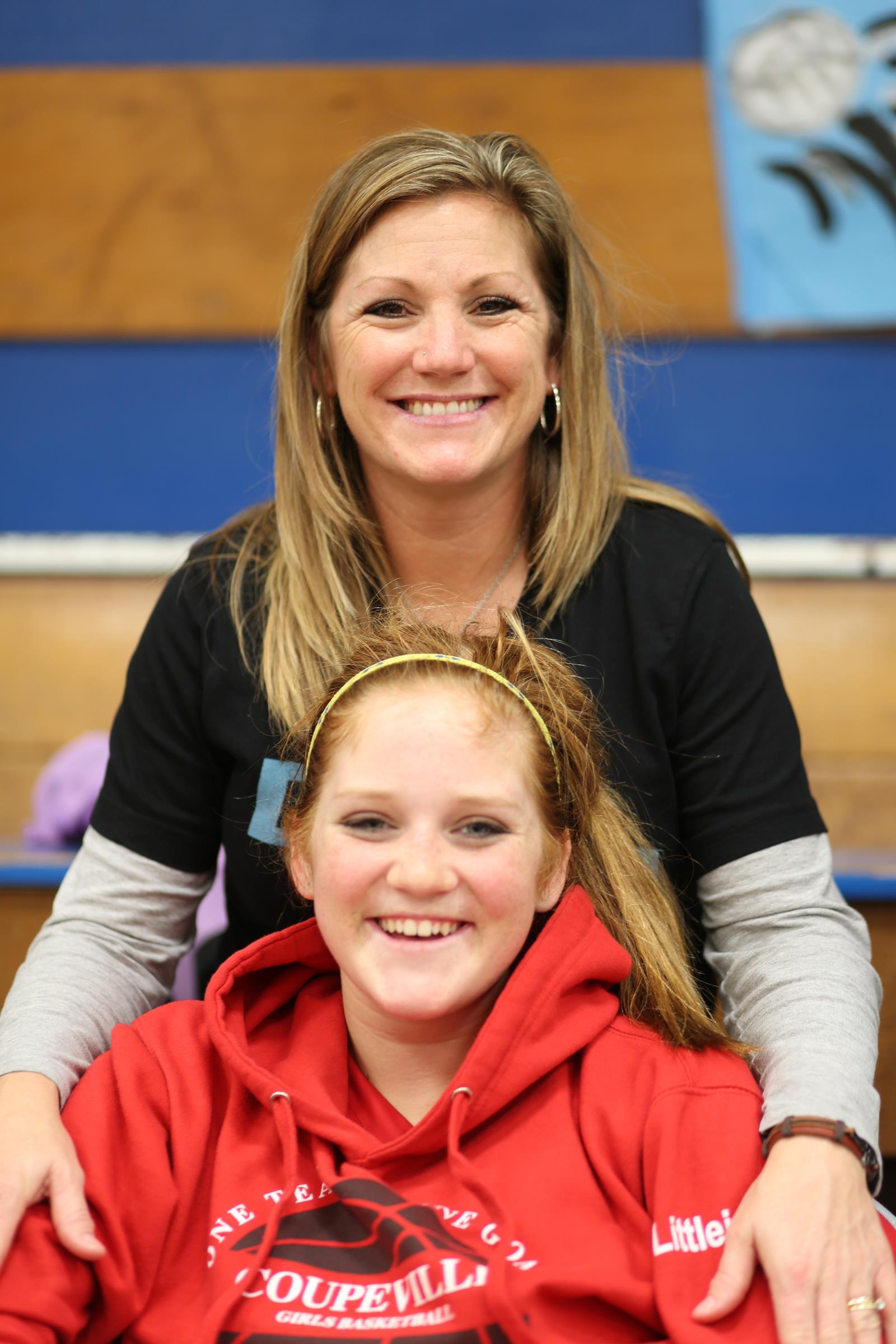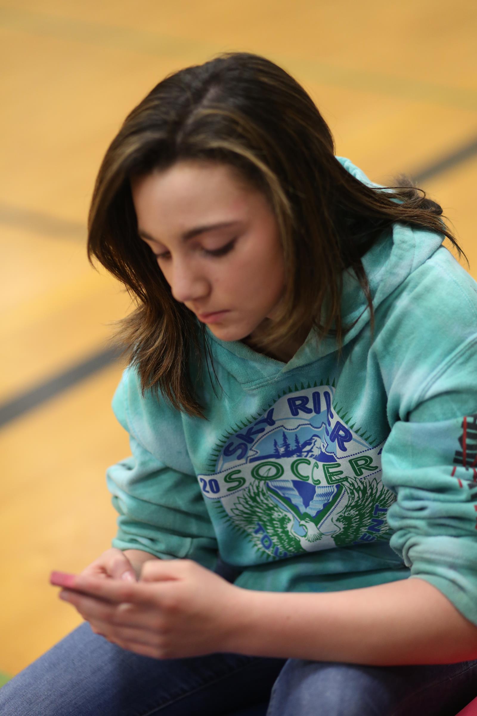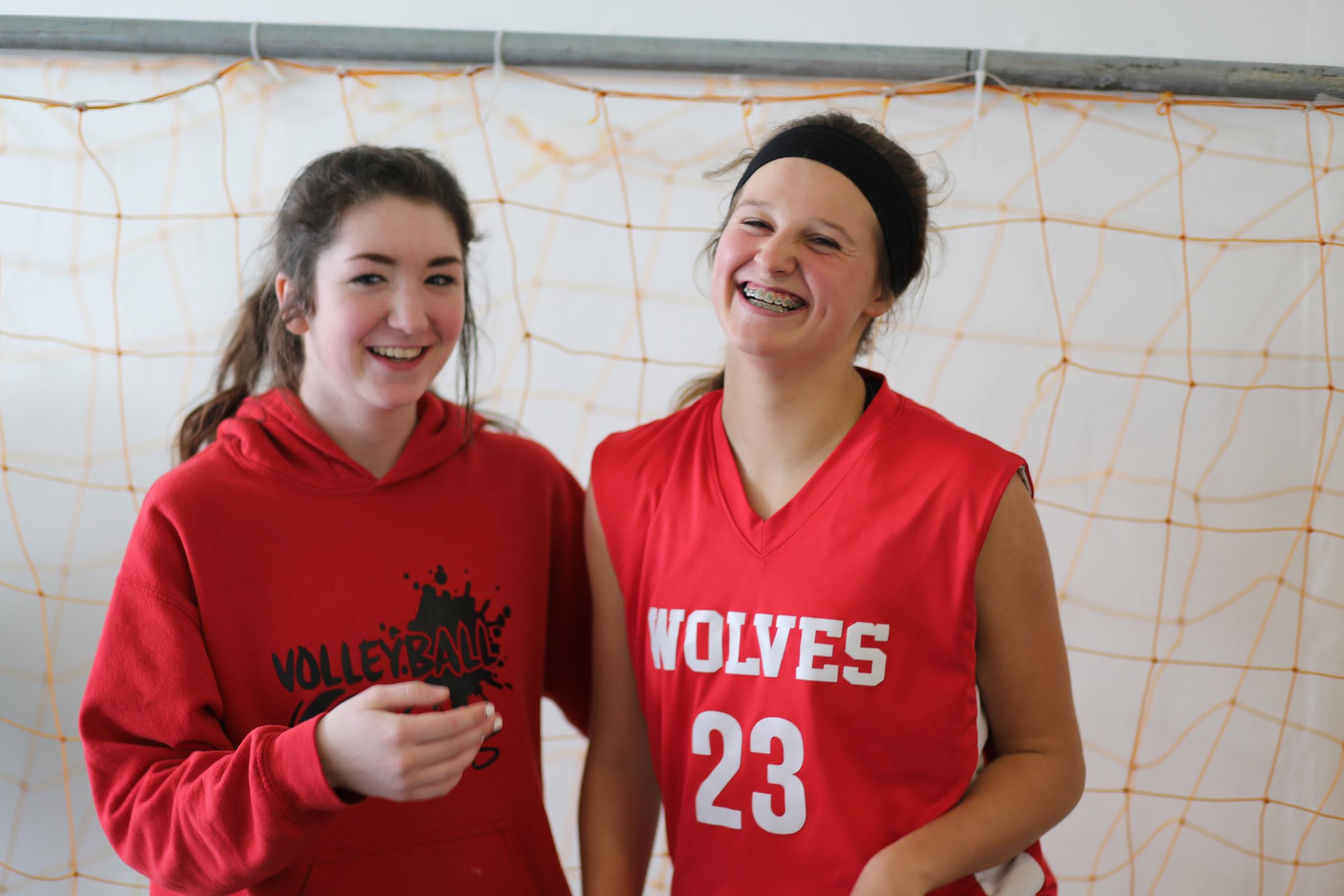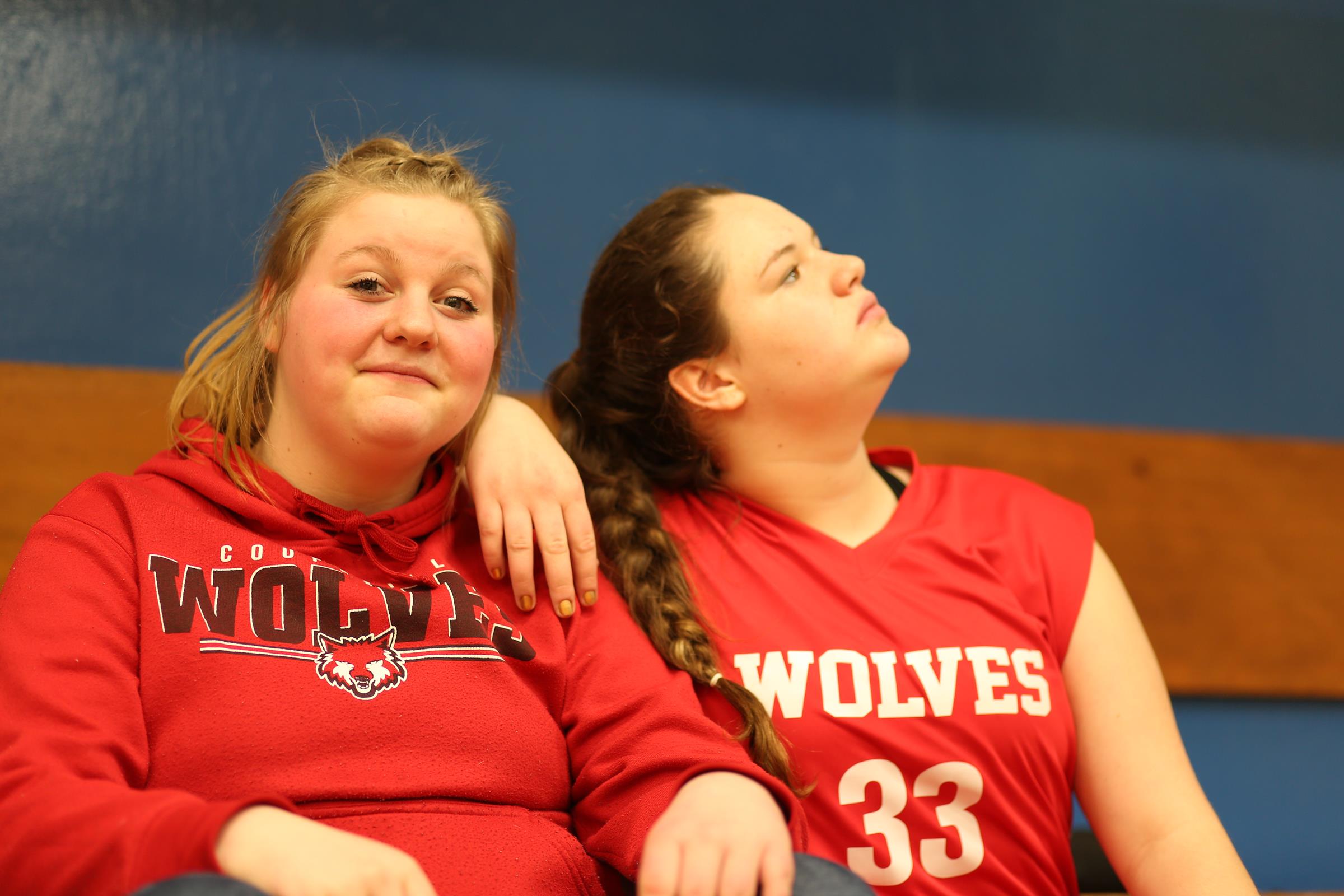 Wolf jumpers (l to r) Cassidy Moody, Tia Wurzrainer, Moira Reed, Nastali and Nicole Laxton do serious prep work before their events.