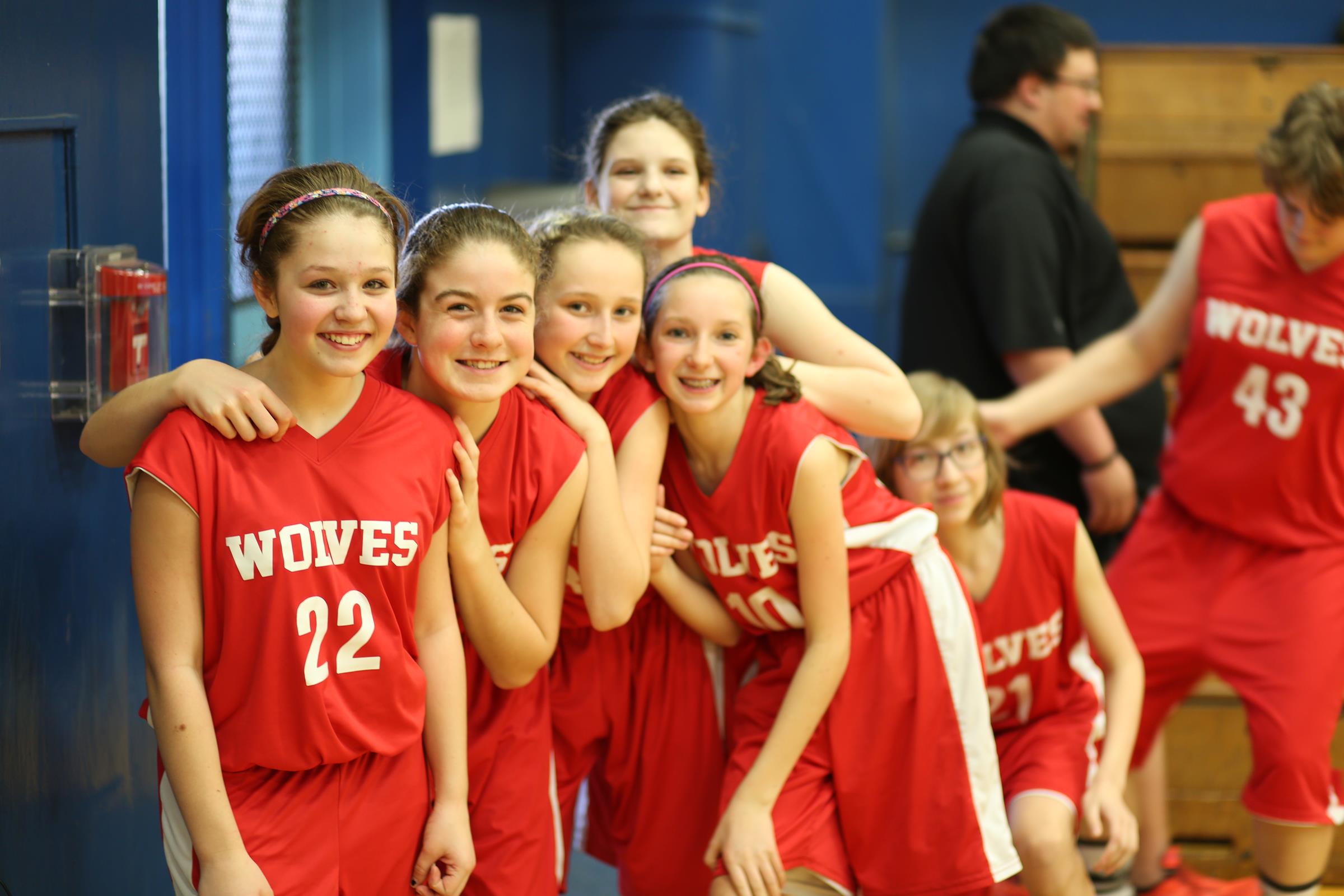 More Wolves show up. This time, it’s (l to r) Mallory Kortuem, Wurzrainer, Moody, Maya Toomey-Stout, Megan Thorn, Avalon Renninger, Roberts and Shank.