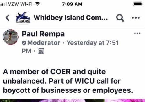 Or Whidbey short-timers like Paul Rempa, (now hiding as Paul TR on Facebook) who enjoys harassing grandmothers whose family roots in Coupeville stretch back nearly to the first white settlers in the area.
