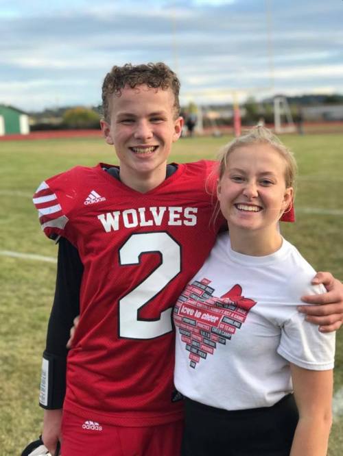 Caleb Meyer, with his #1 cheerleader, big sis Mckenzie, sealed Coupeville’s 14-13 win Wednesday with a last-second fumble recovery. (Frank Meyer photo)