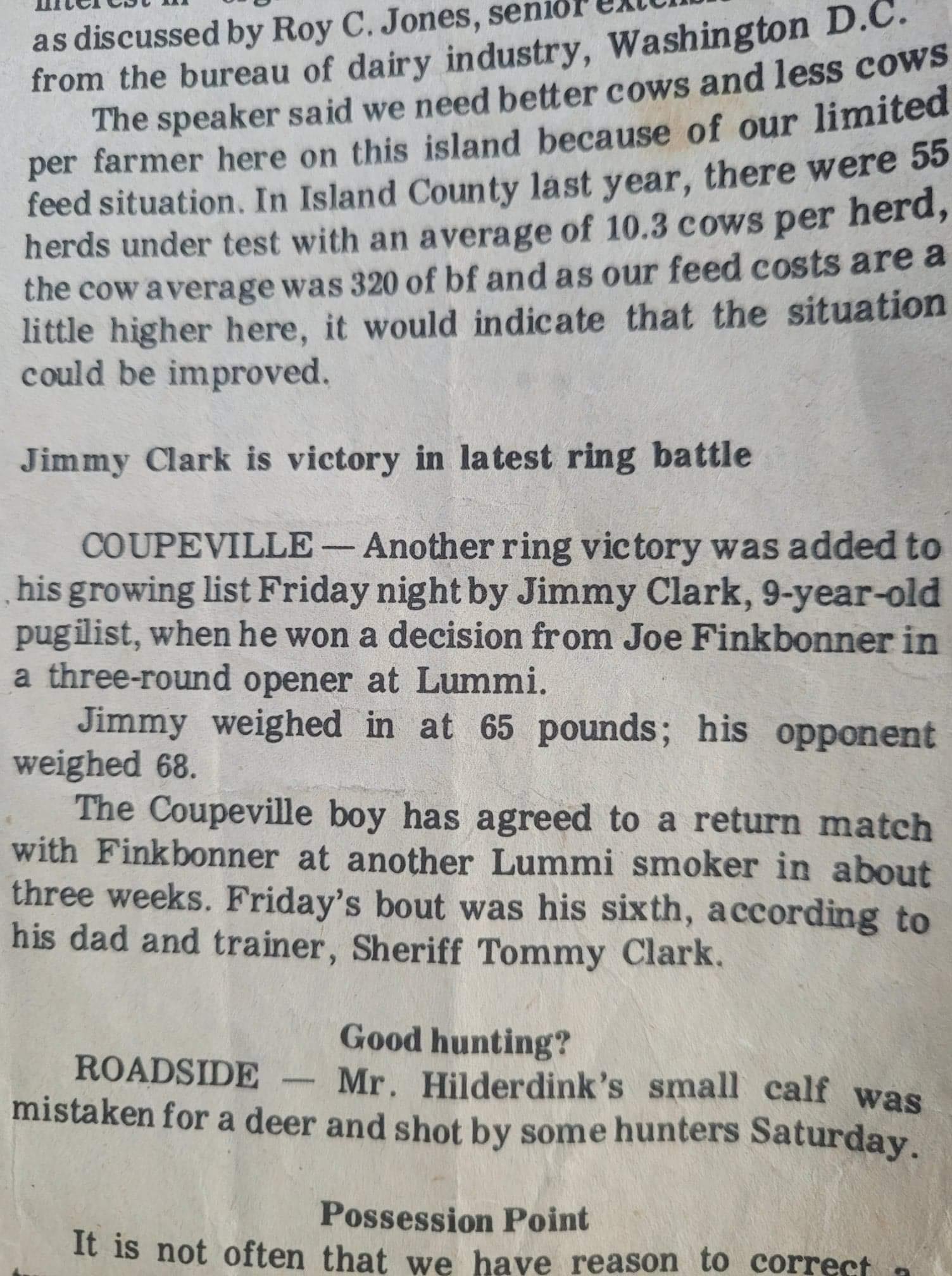 Of course, right below the boxing recap is a brief note about Mr. Hilderdink’s small calf being mistaken for a deer and shot to heck by hunters who left their bifocals at home.