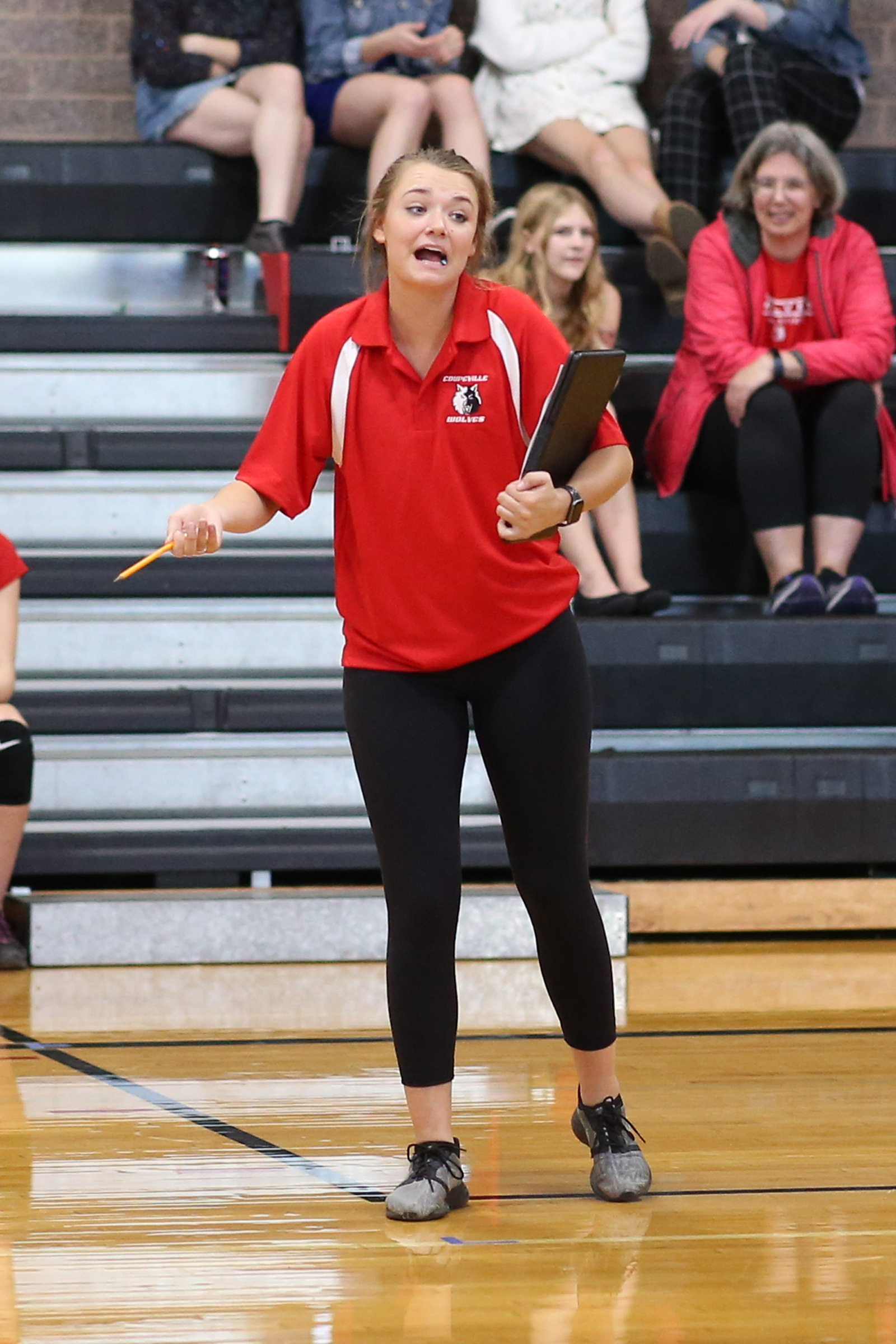 It’s about Rector, poppin’ gum and pumpin’ fists, as she rambled into the big gym to join fellow Wolf coaches Cory Whitmore and Chris Smith for the varsity contest.