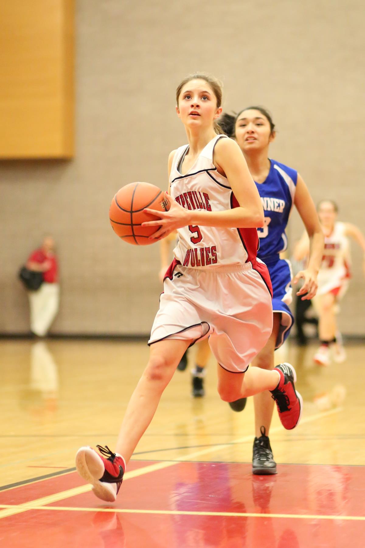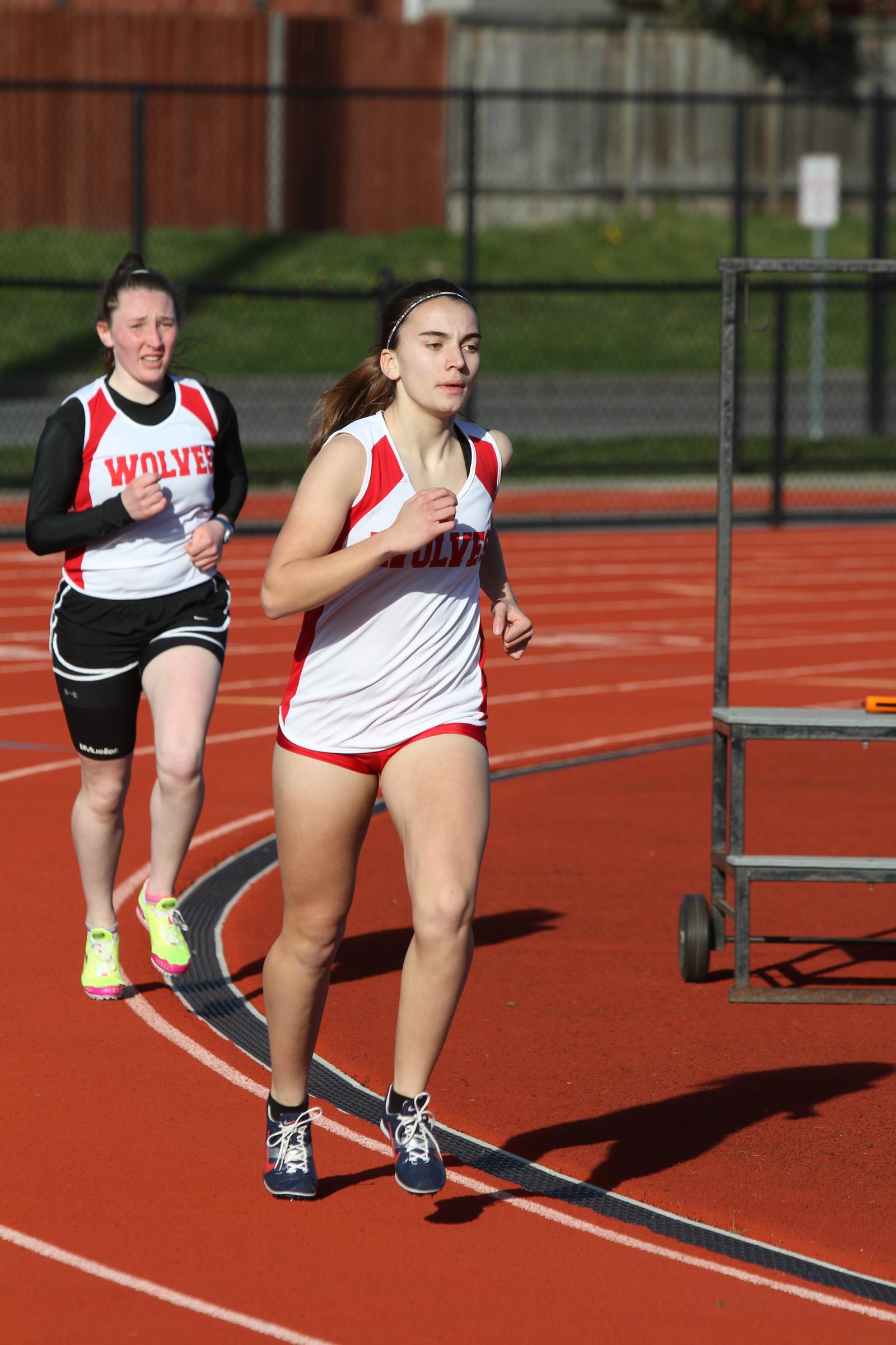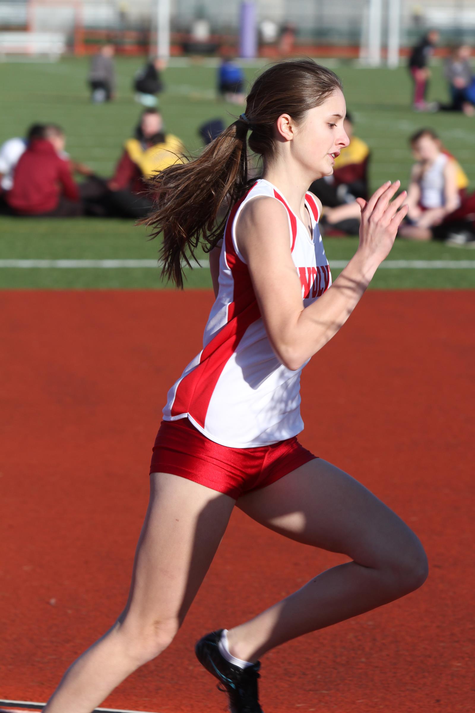 Wolf freshman Carlie Rosenkrance out-dueled four runners in the 800 to claim her first high school victory. (John Fisken photos)