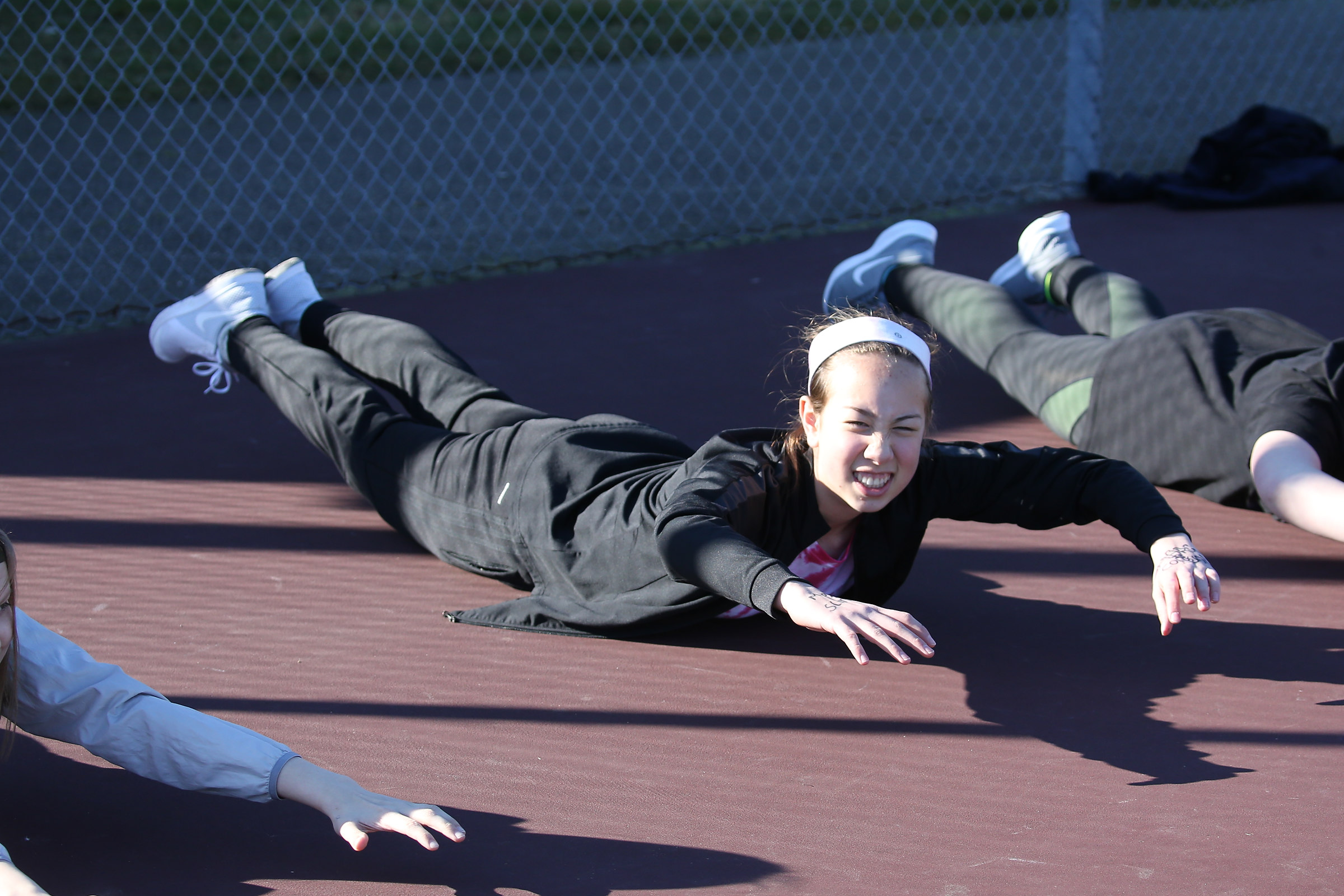 Lola Jimenez gets the blood flowing during tennis warm-ups.