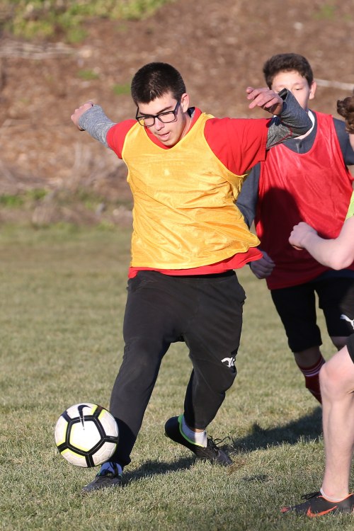 Andrew Aparicio takes control of the ball during a soccer scrimmage.