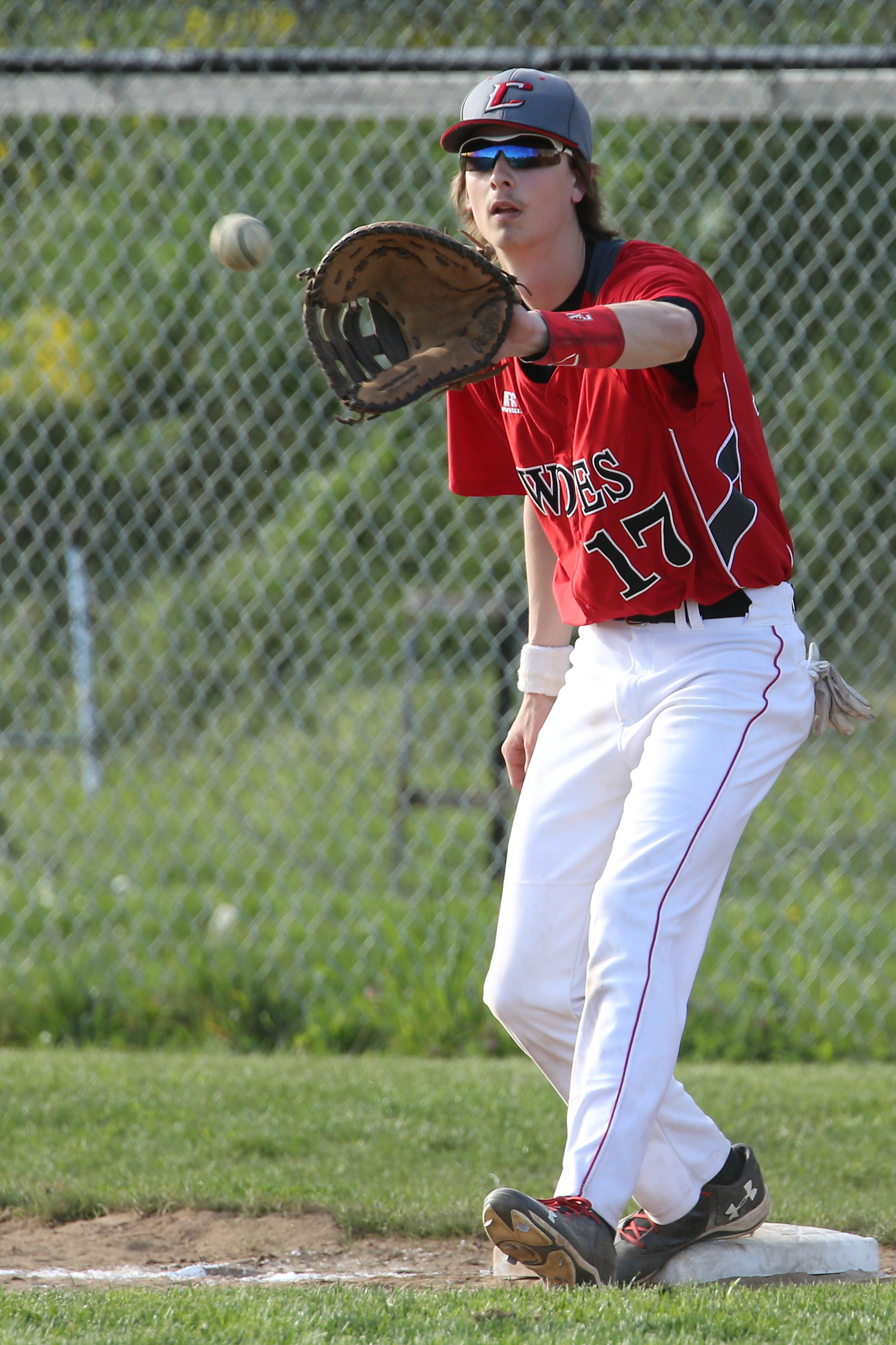 CJ Smith, seen here covering the bag at third in an earlier game, tossed another gem on the mound Monday. (John Fisken photos)