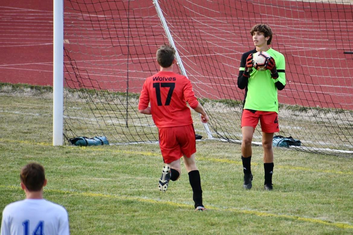 Wolf goalie Nick Guay surveys the field after making a save.