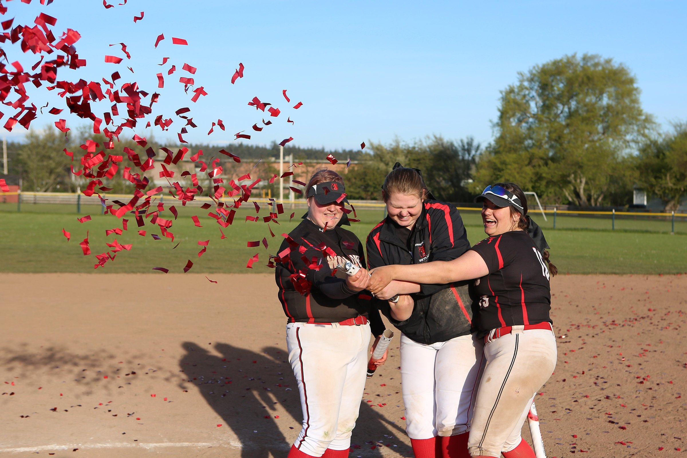 Seniors (l to r) Nicole Laxton, Veronica Crownover, and Sarah Wright celebrate their home finale with confetti cannons. (Photo by JohnsPhotos.net)