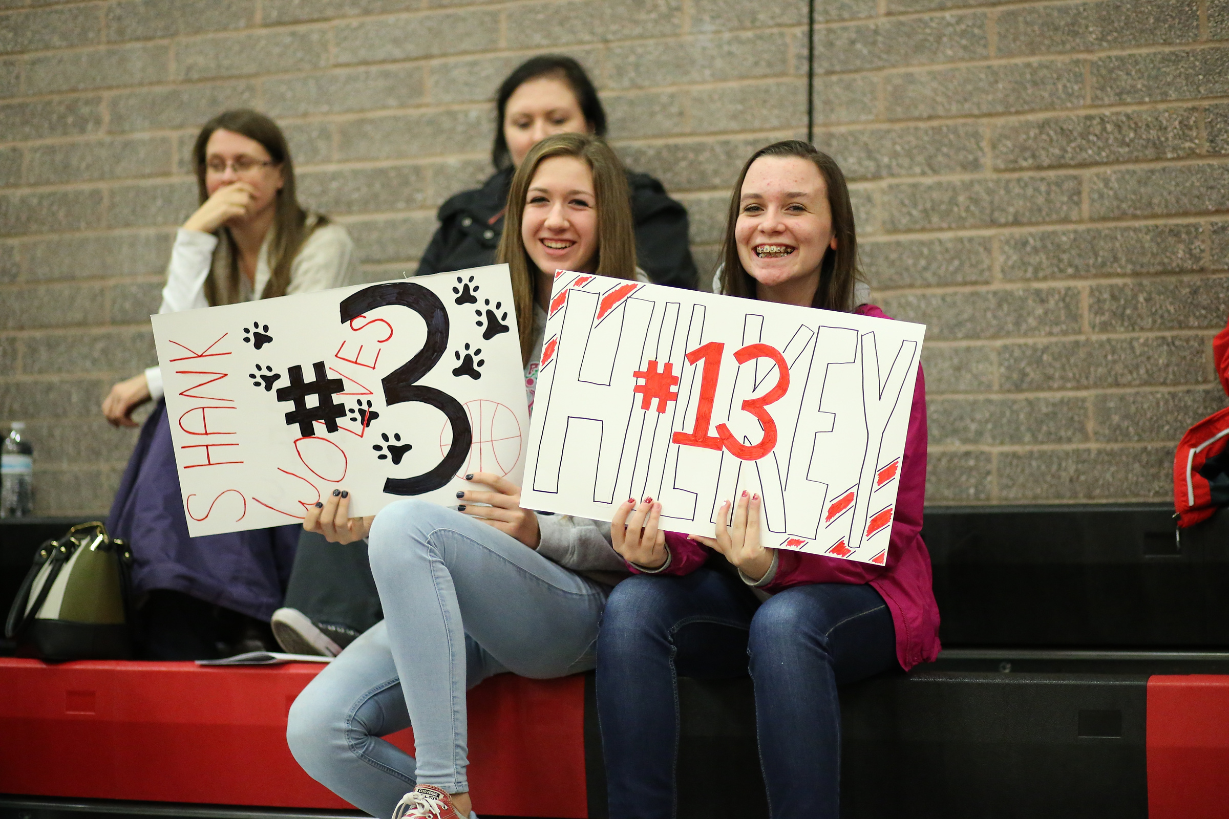 Super fans Emma Smith (#3 sign) and Ashley Menges are on hand to root for fellow frosh Ashlie Shank and Maddy Hilkey.