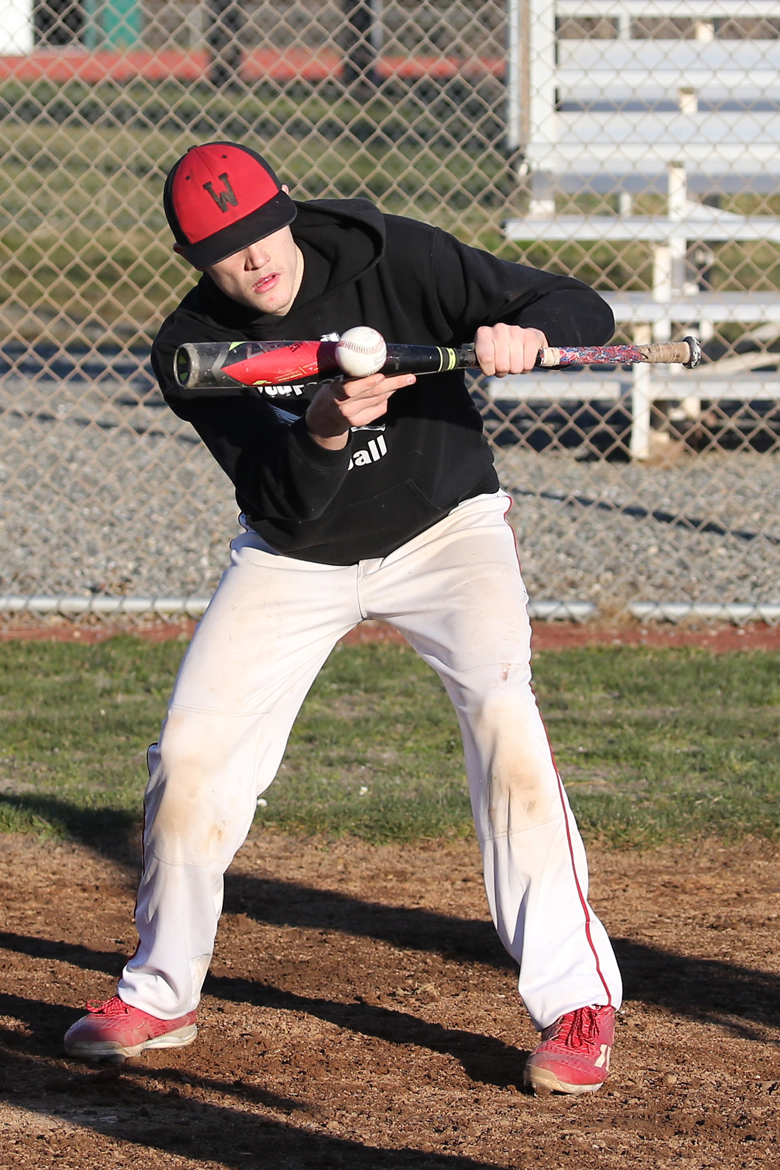 Gavin Knoblich, here bunting during practice, had one of Coupeville’s two hits Monday night. (Photo by JohnsPhotos.net)