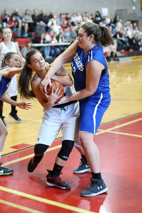 Nezi Keiper (middle) gets mugged in broad daylight, but refuses to surrender the basketball. (Photos by JohnsPhotos.net)