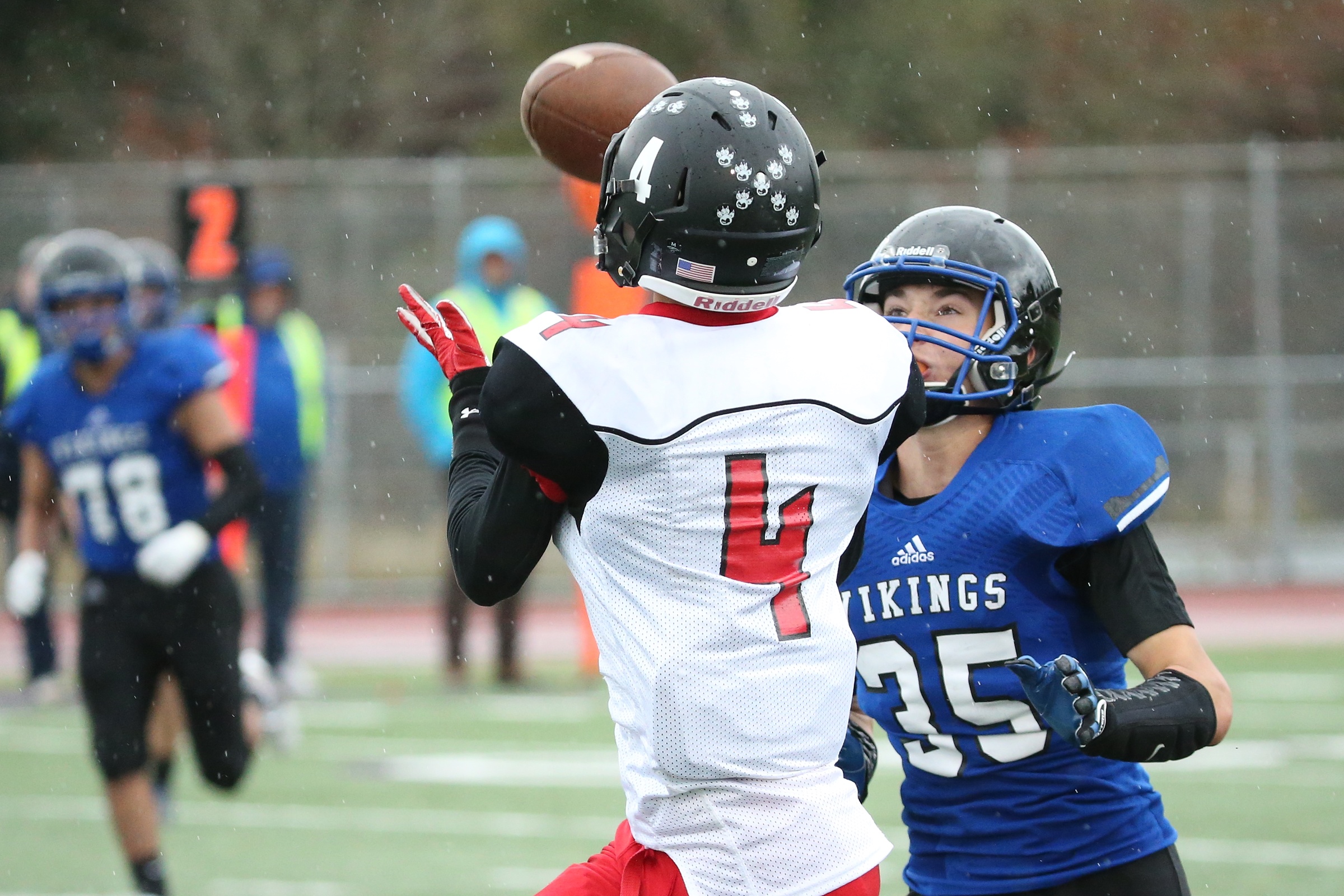 But the football gods, unlike the weather gods, were not smiling on Coupeville, as a Bellevue player read things correctly, jumped the route and picked off Downes on the Wolves next play.