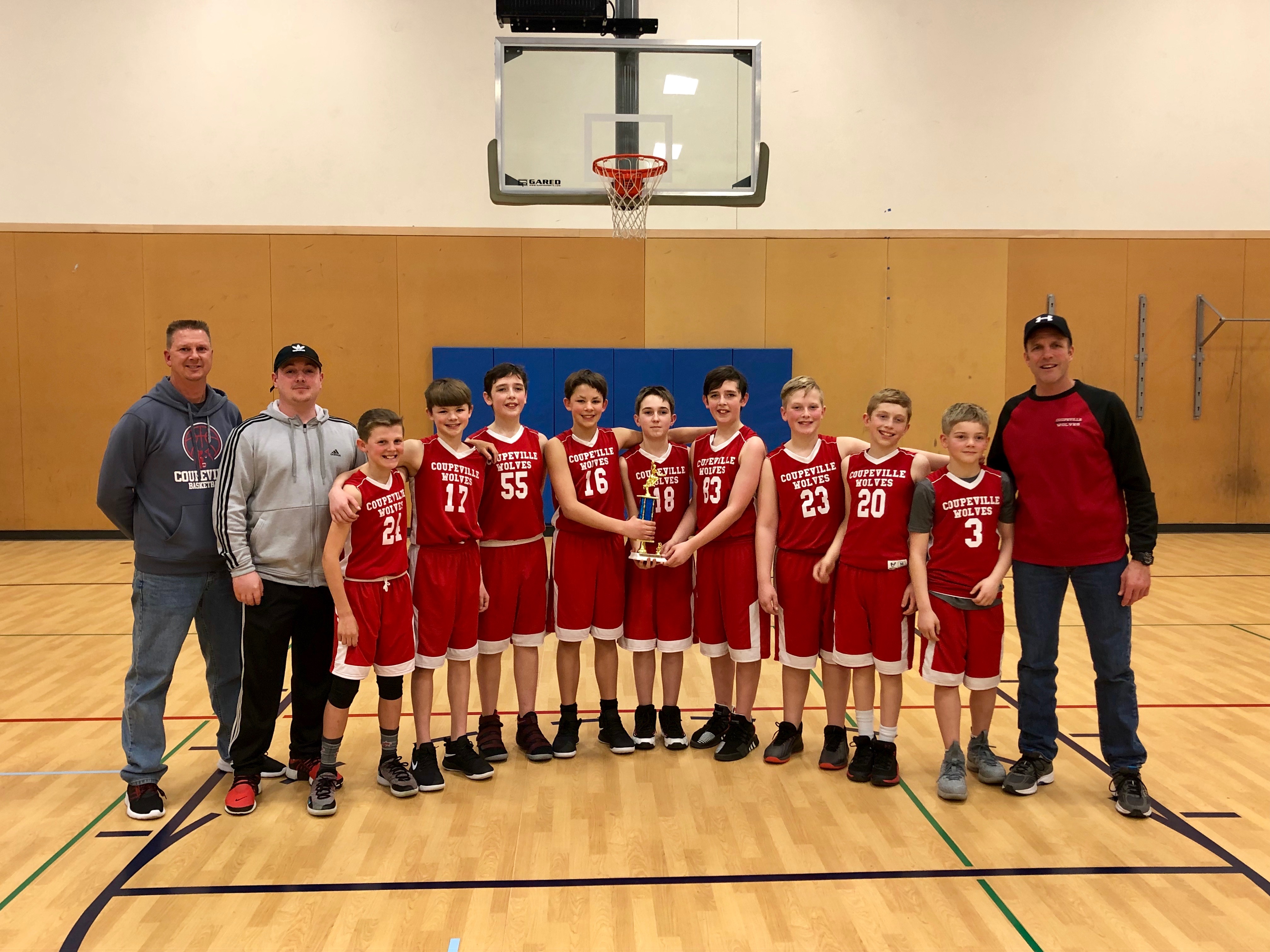 Seeded #4, Coupeville’s 5th/6th grade boys SWISH basketball team brought home a second-place trophy Saturday after winning two of three games at the season-ending league tourney. (Photos courtesy Jon Roberts)