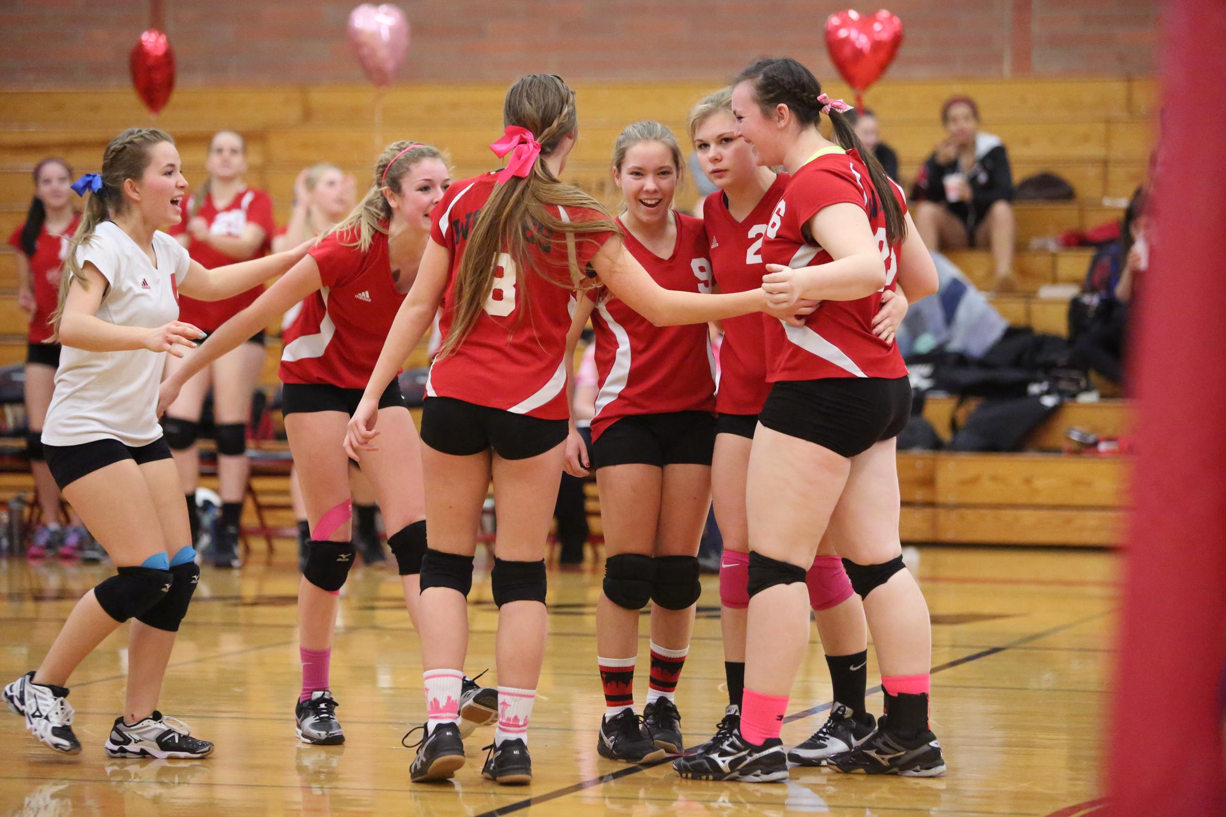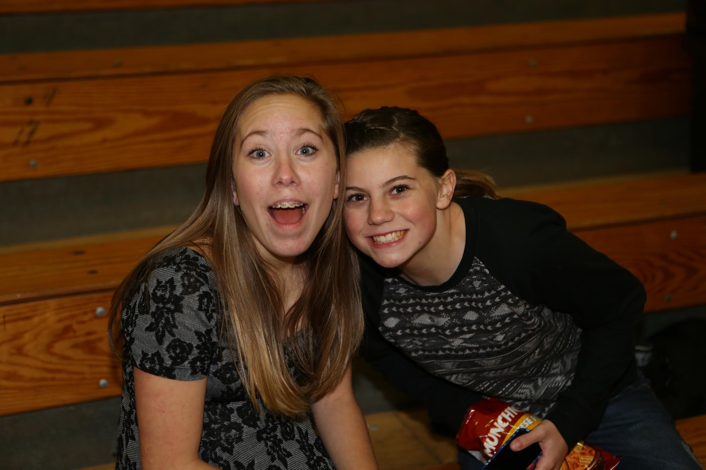 Jae, the shortest volleyball player, sitting (well, bouncing in her seat) next to Allie Hanigan, the team’s tallest player, on the bench.