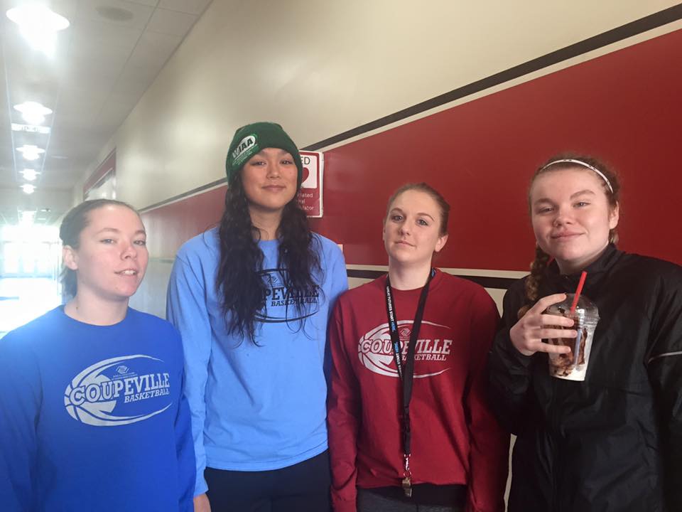 Former Wolves Makana Stone (second from left) and Kailey Kellner (far right) are now college hoops stars. (Amy King photo)