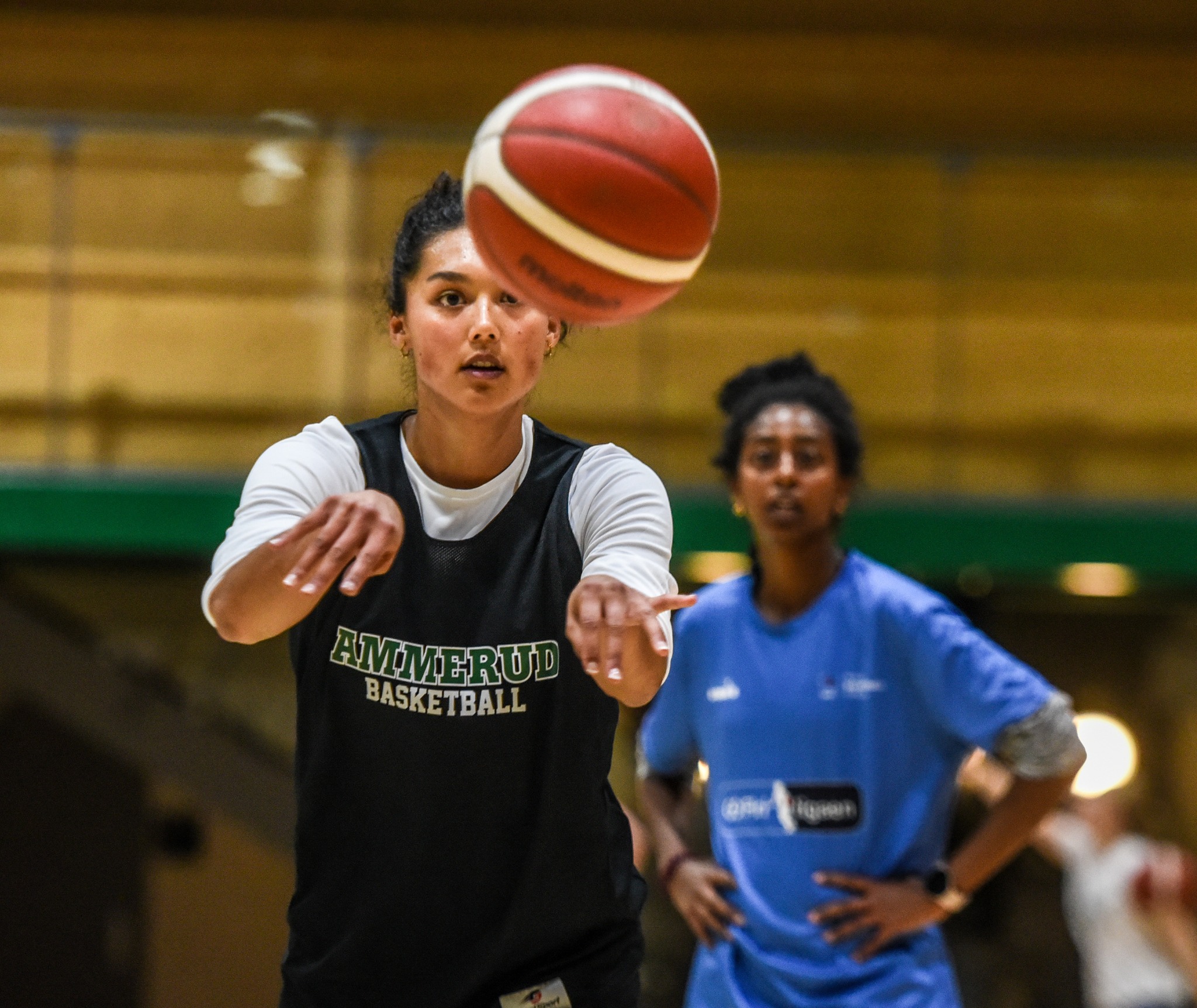 Coupeville grad Makana Stone flicks a pass in the direction of a Norwegian hoops teammate. (Photo property of Erik Berglund)