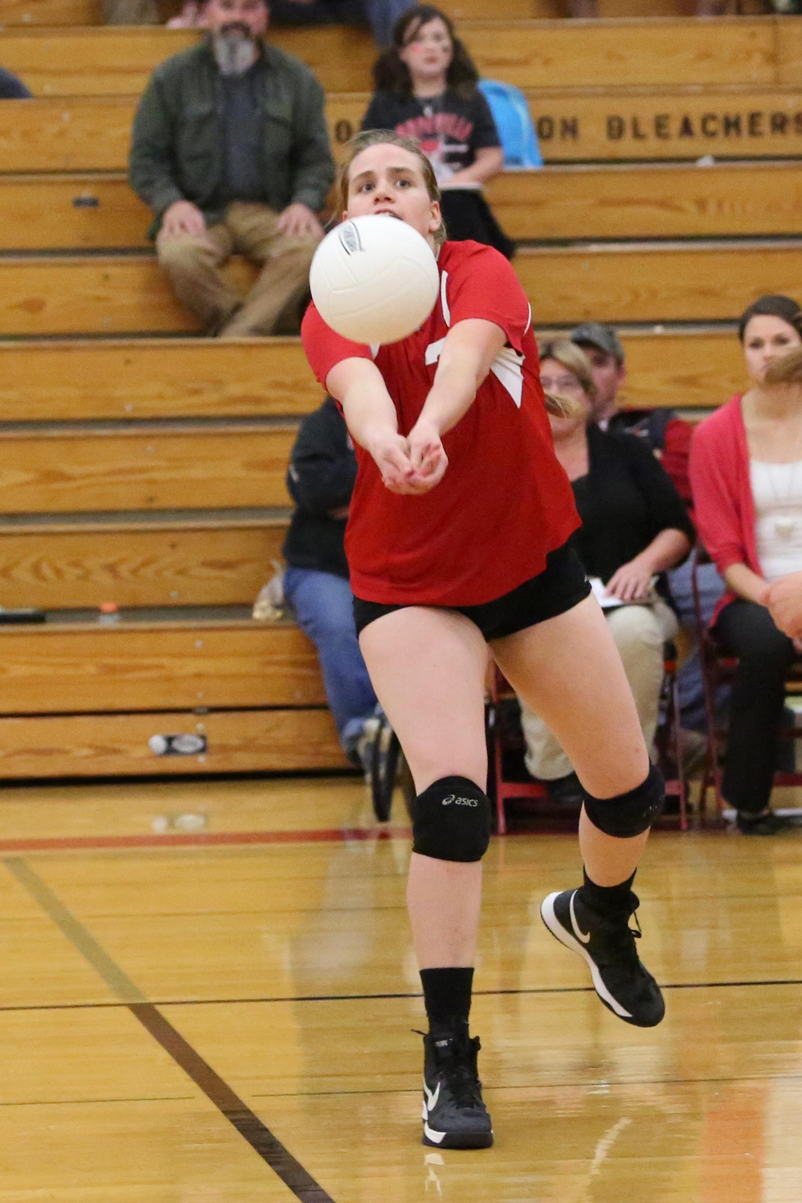 Madeline Strasburg, one of five seniors trying to keep their high school spiker careers going past the evening, jumped out of her shoes on her first several spikes.