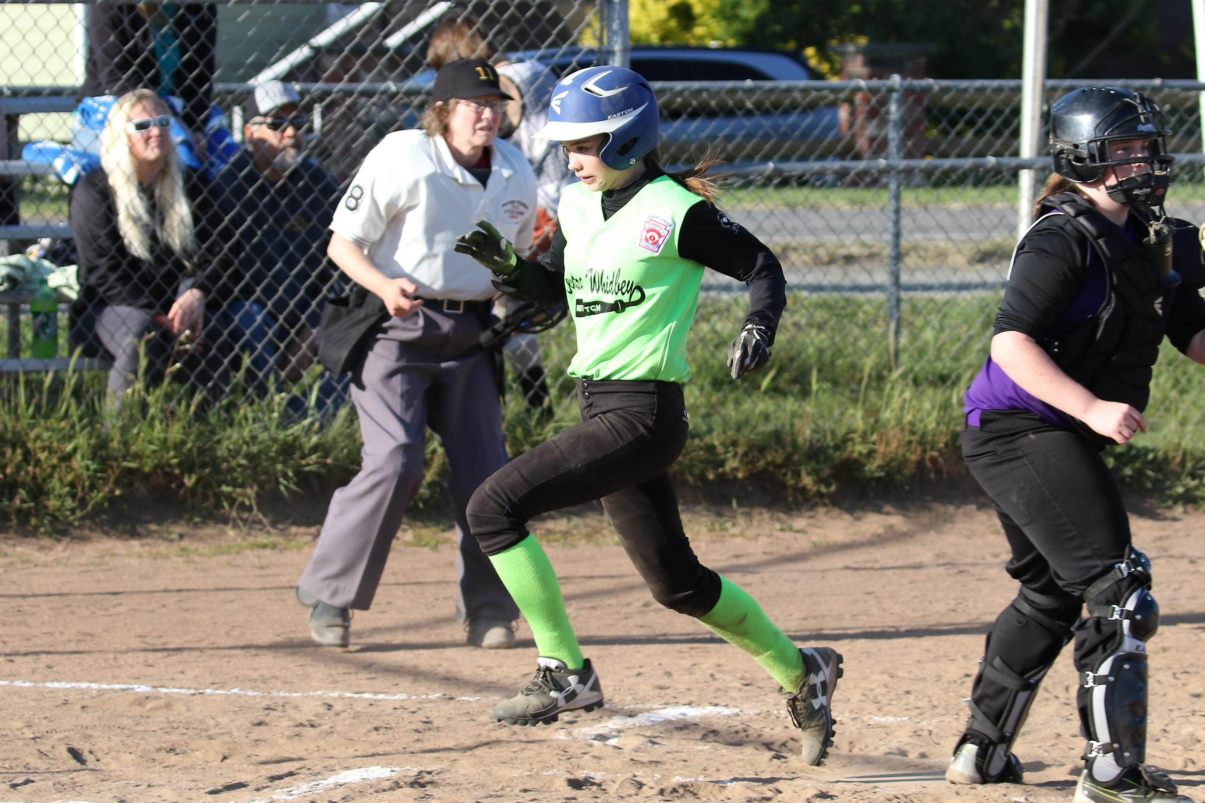 “There was a short throw to first and it made her come off the bag to get it, but she dove back to tag the base just in time.”