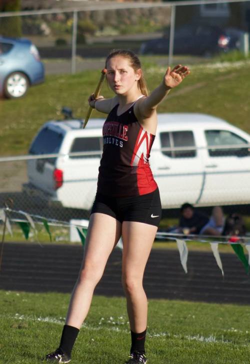 Coupeville’s Carolyn Lhamon lets it rip Tuesday, beating her shot put PR by more than five feet. (Helene Lhamon photo)