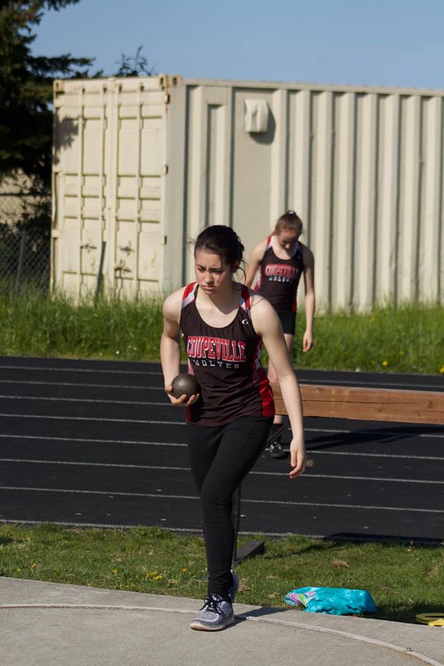 Coupeville’s Carolyn Lhamon lets it rip Tuesday, beating her shot put PR by more than five feet. (Helene Lhamon photo)