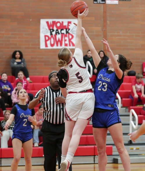 Coupeville forced a shot clock violation on the game’s opening possession, before Wolf senior Danica Strong later rippled the nets on a three-ball to give her team its only lead of the night at 3-2.