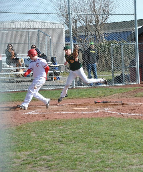 Bryce Payne scores his first run Saturday, joining older brothers Morgan and Cole as “made men” for CHS baseball. (Joan Payne photo)
