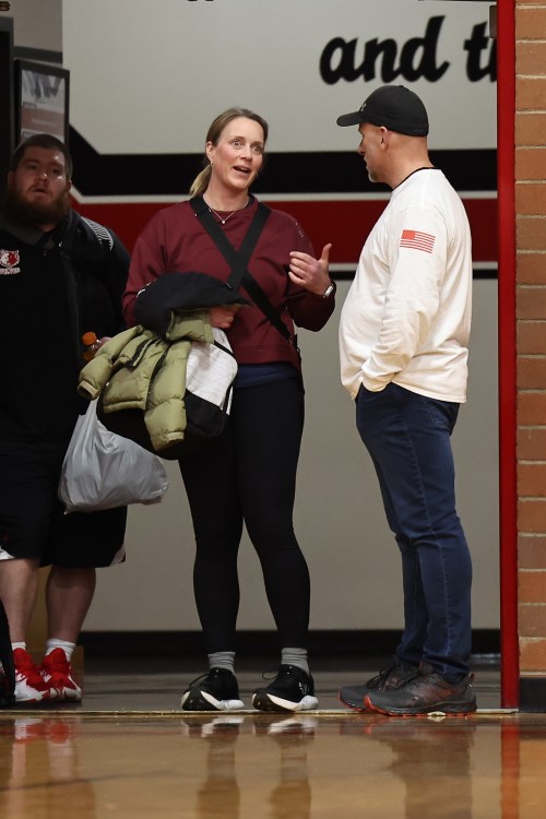 Coaches Bennett Richter (left) and Brooke Crowder share practice stories with Bob Martin, a veteran of the middle school wars.