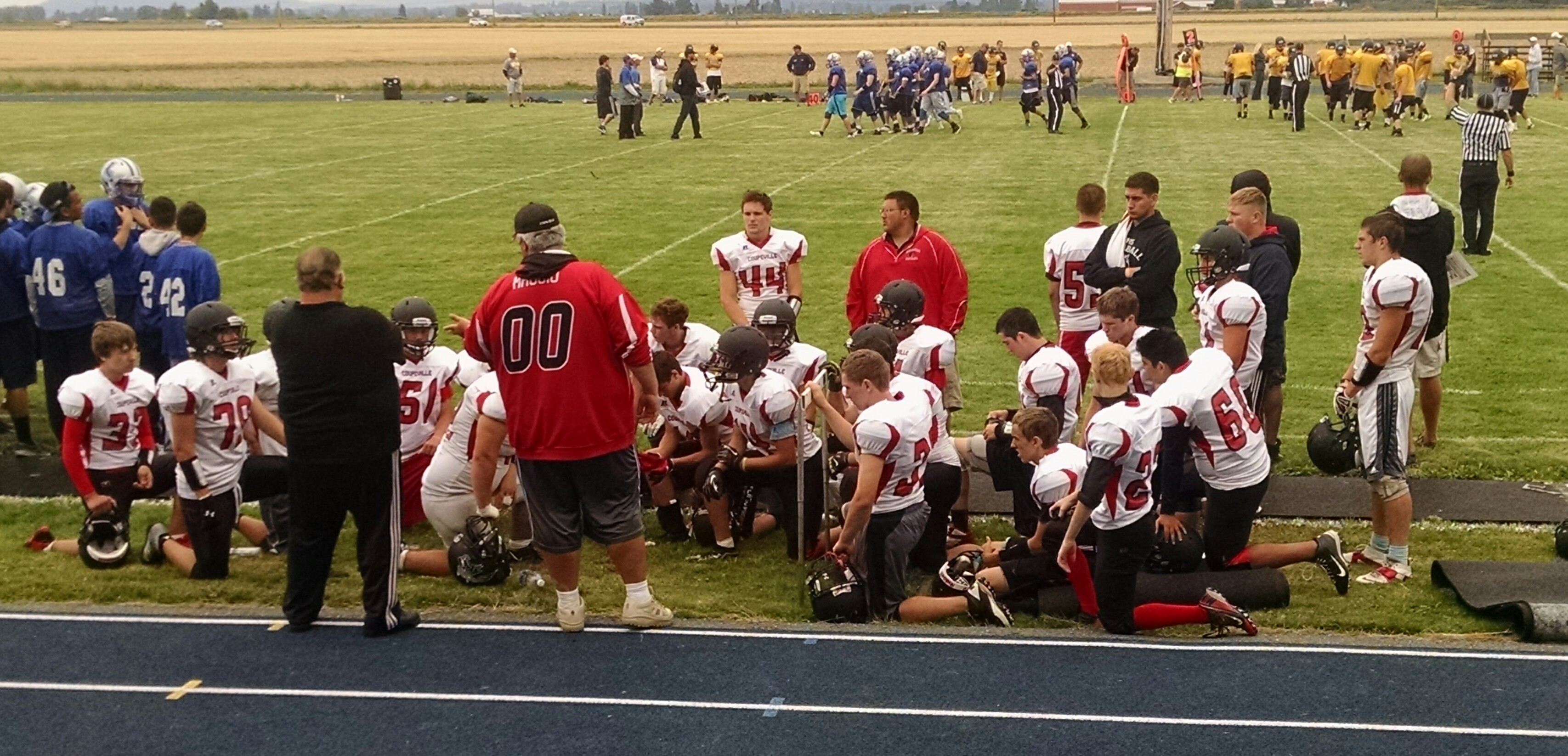 Wolf coach Tony Maggio (00) talks to his team during Friday’s three-team scrimmage in La Conner. (Shawn Walstad photo)