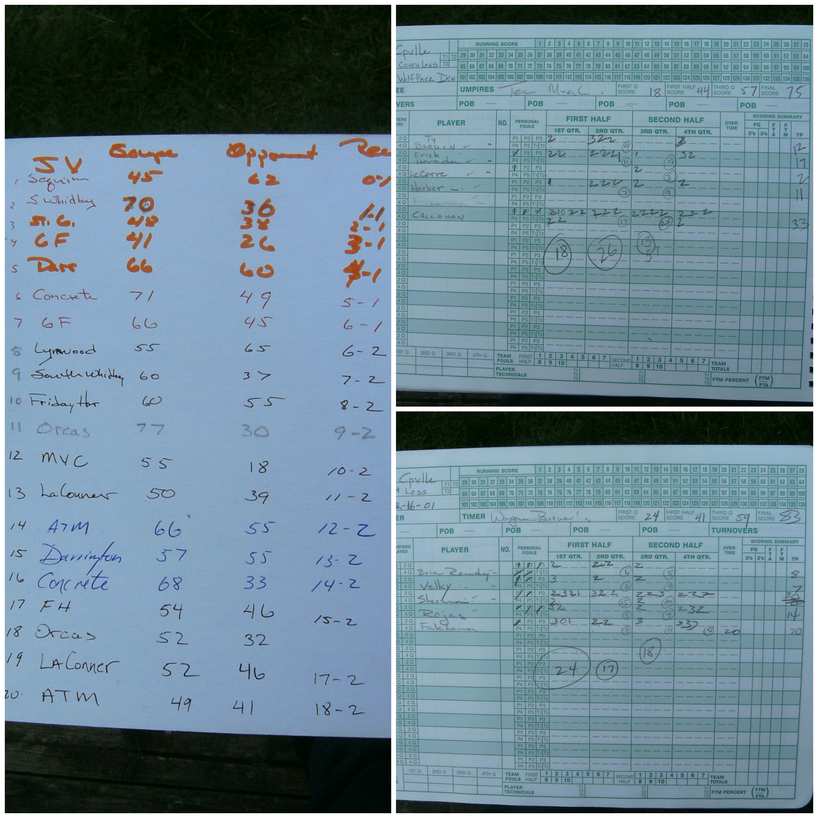 Gems from the back of various score-books. On the left is the scrawled record of the 1999-2000 CHS boys JV team. At right, an intrasquad game from Feb., 2001.