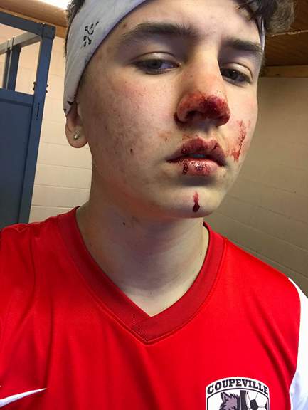 While charging out to snare a ball, he got inadvertently kicked in the face by an incoming player, which left him bloodied.