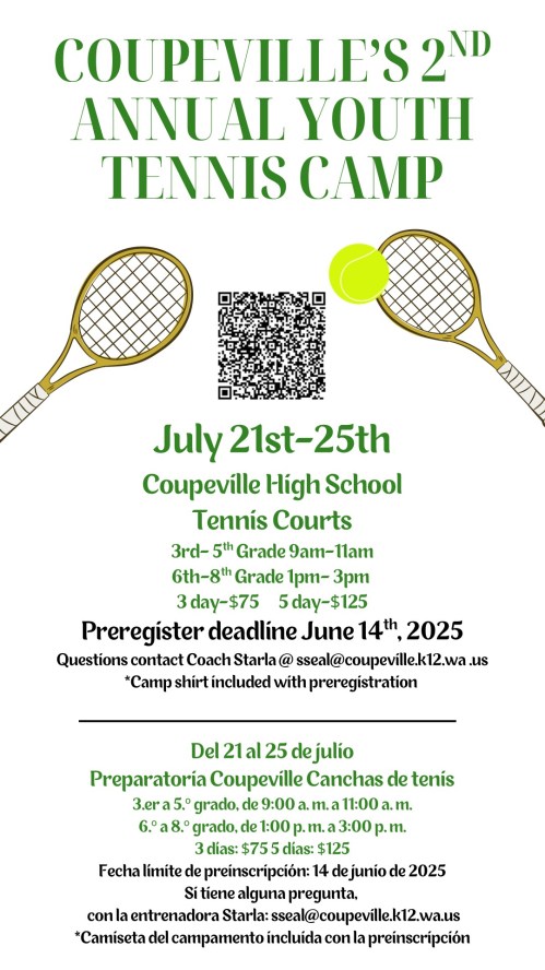 Coupeville High School tennis coaches Starla Seal and Tim Stelling are back to host a skills camp for young netters, with slots open to girls and boys entering grades 3-8.