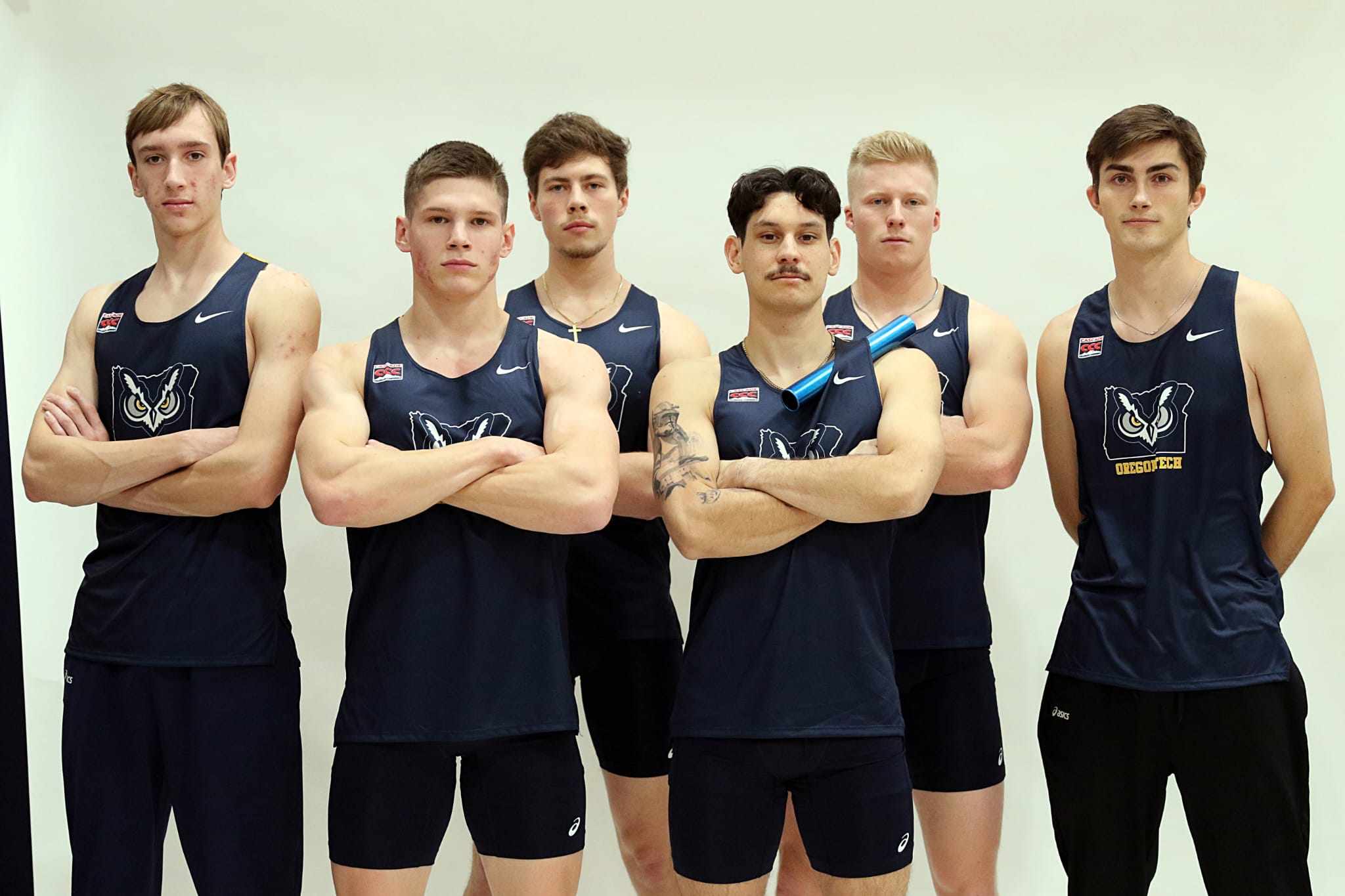 Tate Wyman (far left) made his college track debut this past weekend. (Photo property Oregon Tech track and field)