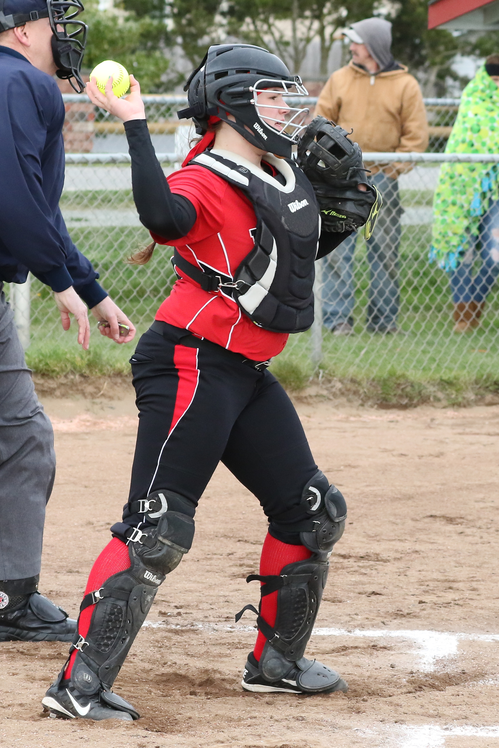 Perhaps rattled just a bit, a pitch got away from her, skipped on the ground and plunked a Falcon hitter who made no effort to get out of the way.