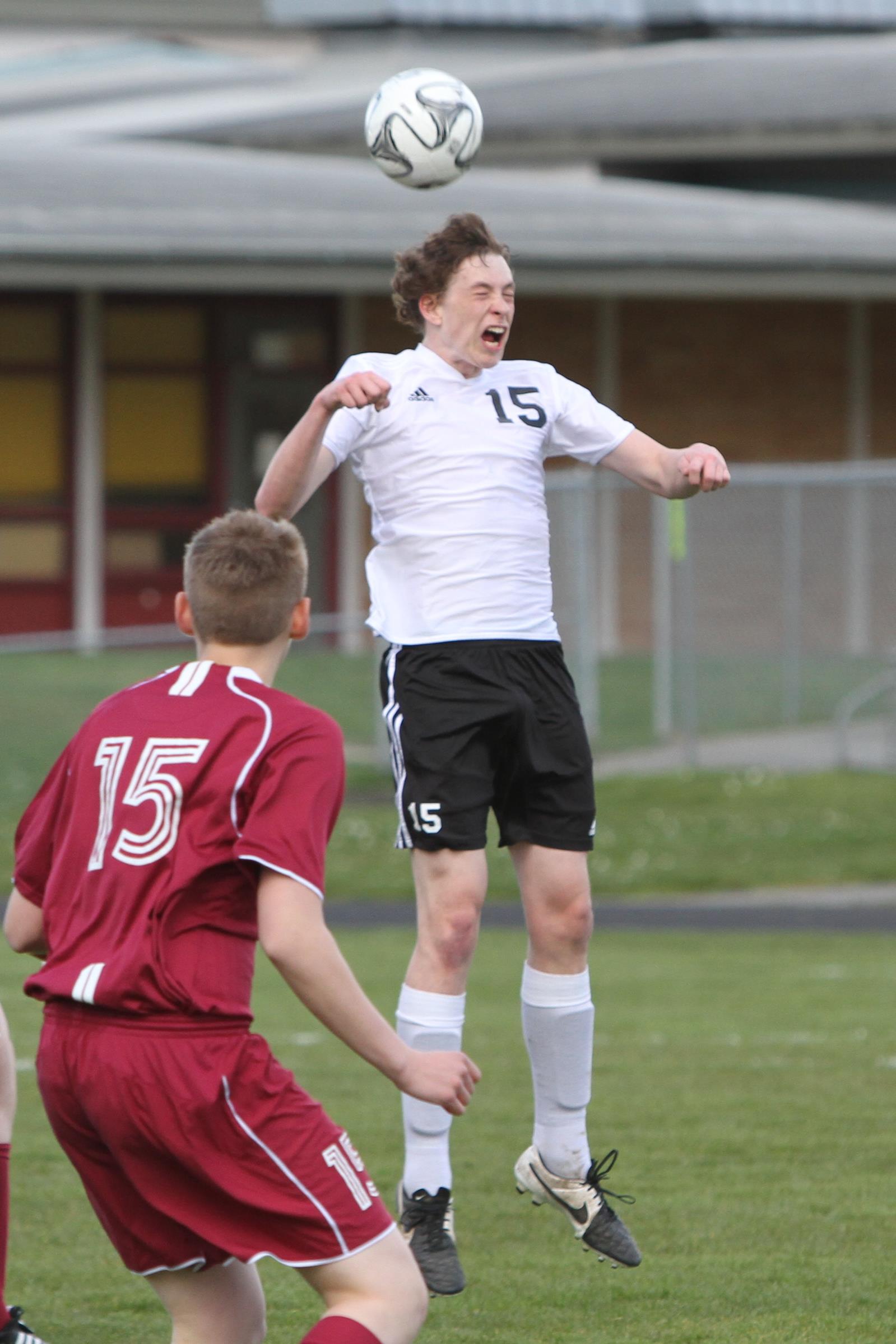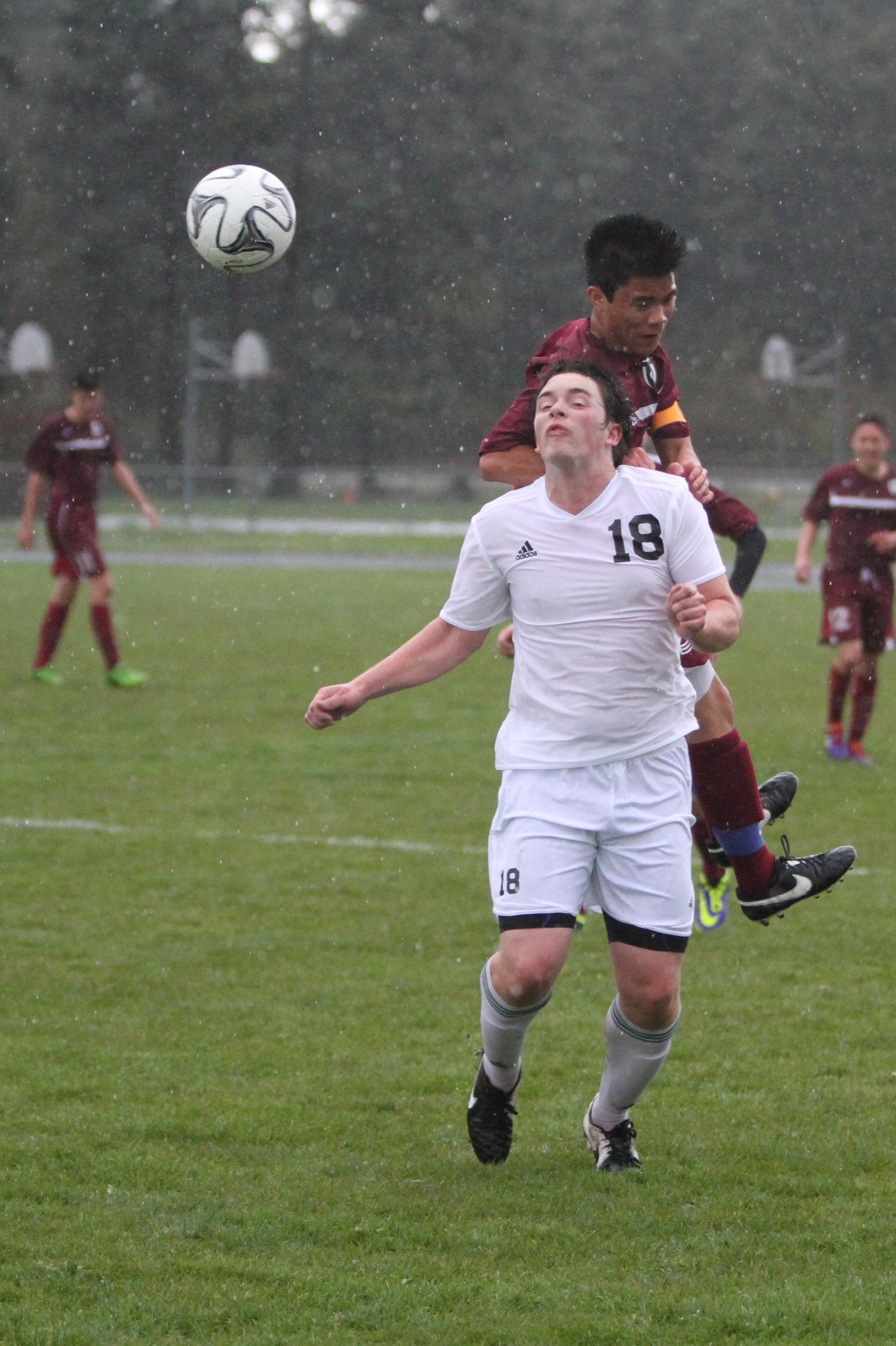 Keegan Korteum (18) and Gunnar Langvold (red headband) battle for CHS earlier this season. (John Fisken photo)